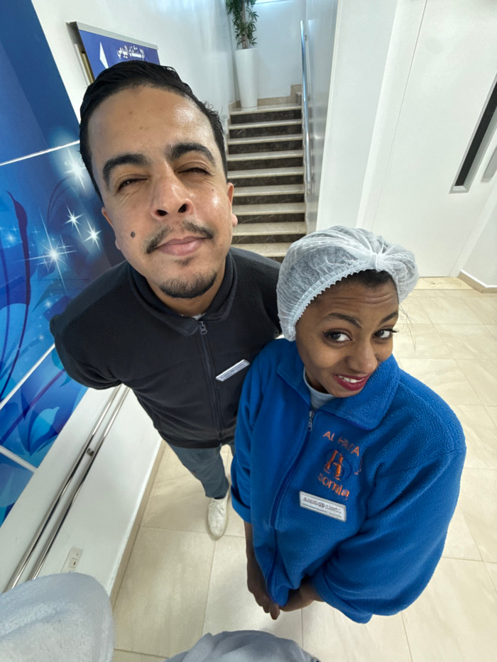 A wide-angle, low-angle indoor photograph captures two individuals posing in what appears to be an administrative or office area of the Al Hafa agribusiness company in Meknes, Morocco. In the foregro…read more
