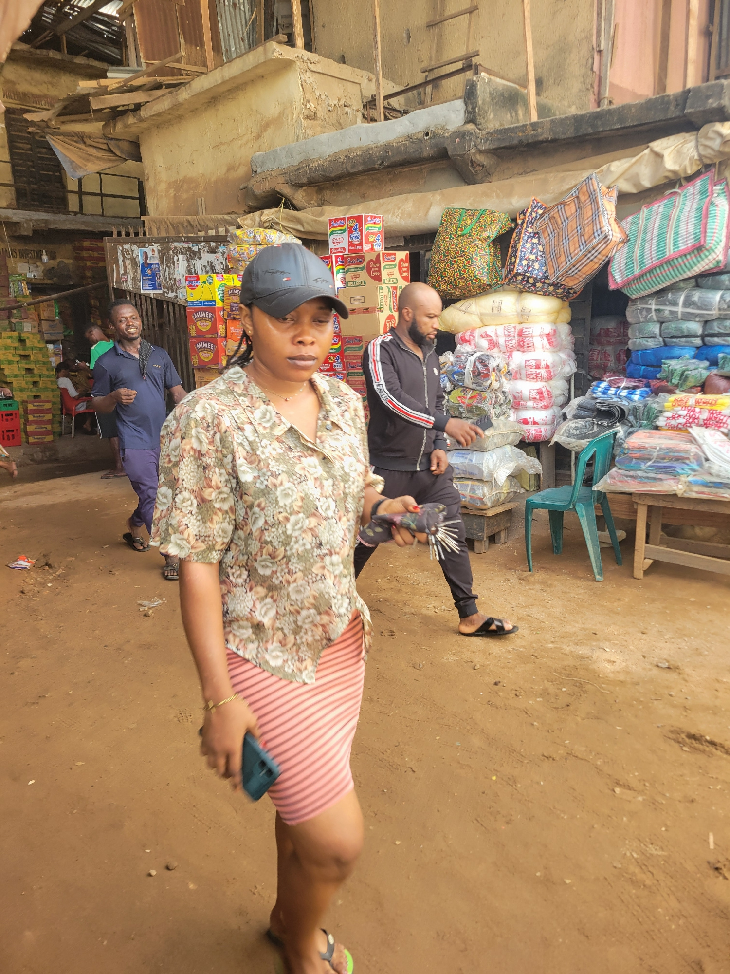 A medium shot depicts a woman in a floral blouse, pink striped skirt, and baseball cap, holding a smartphone and facing the camera. Behind her, a man in a tracksuit reclines amongst stacked merchandis…read more