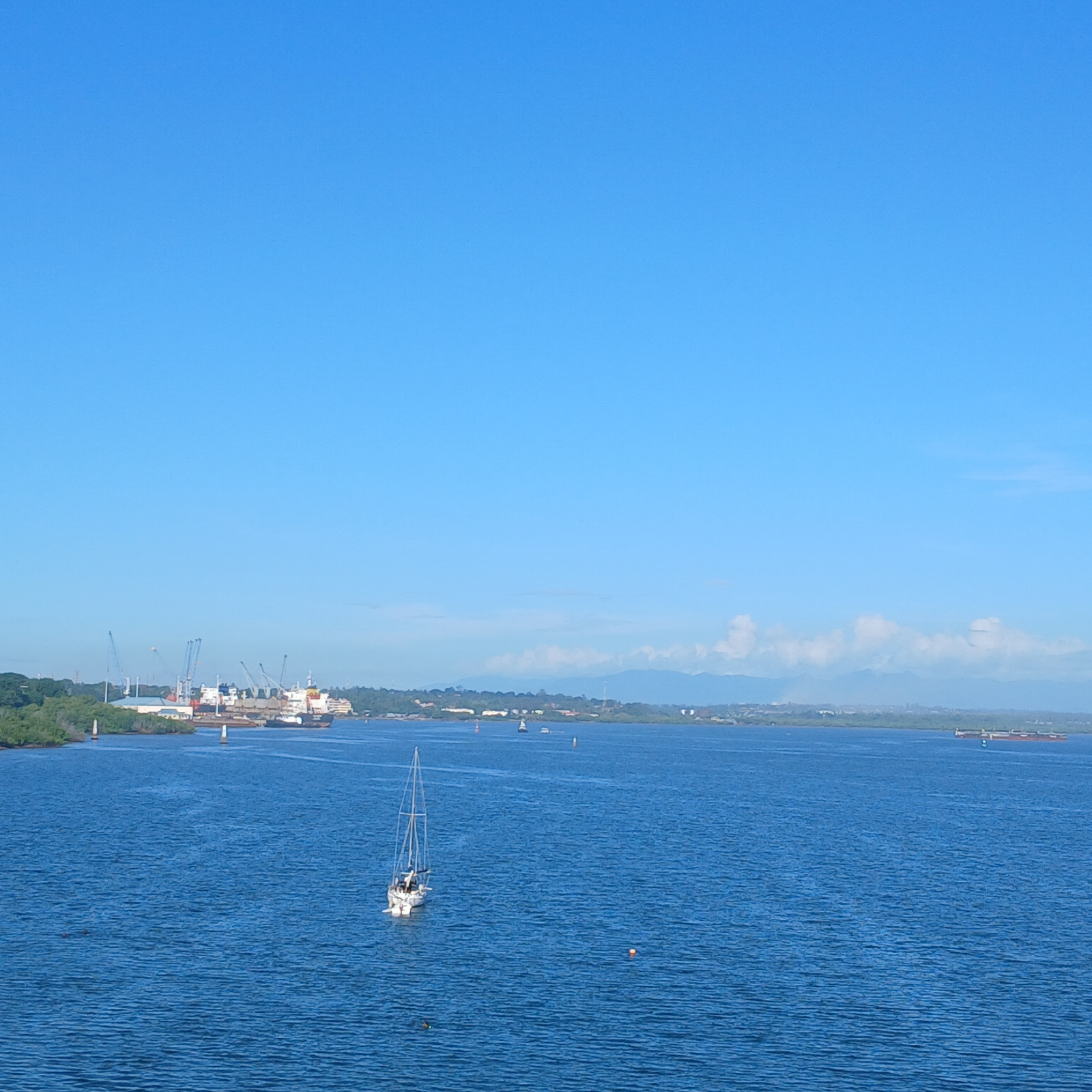 The image presents a wide view of Tanga Bay, Tanzania, under a clear blue sky. The upper portion of the frame is occupied by the bright, cloudless sky. The lower section features blue, rippled water.…read more