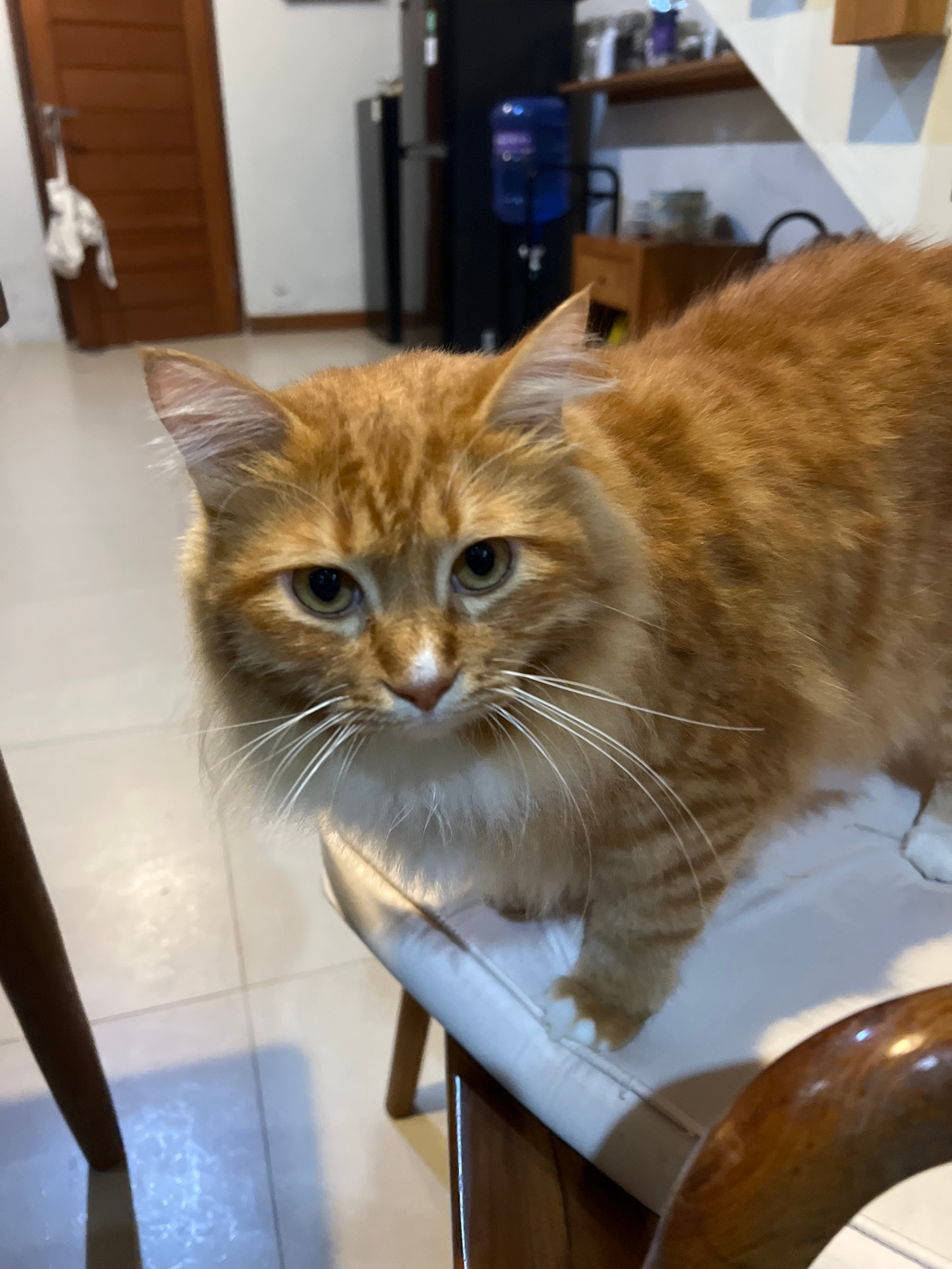 An orange tabby cat with green eyes is lying on a white chair. The cat is looking up at the camera. The background includes a black cabinet, a blue container, and a wooden chair leg. The location is S…read more