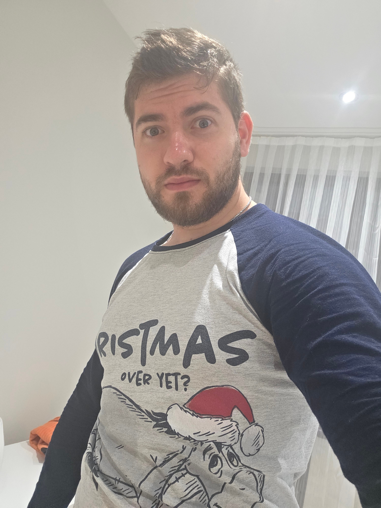 A man is wearing a grey, long-sleeved shirt with blue sleeves. The shirt has a cartoon design of a character wearing a Santa hat, along with the text "RISTMAS OVER YET?". The man has short brown hair…read more