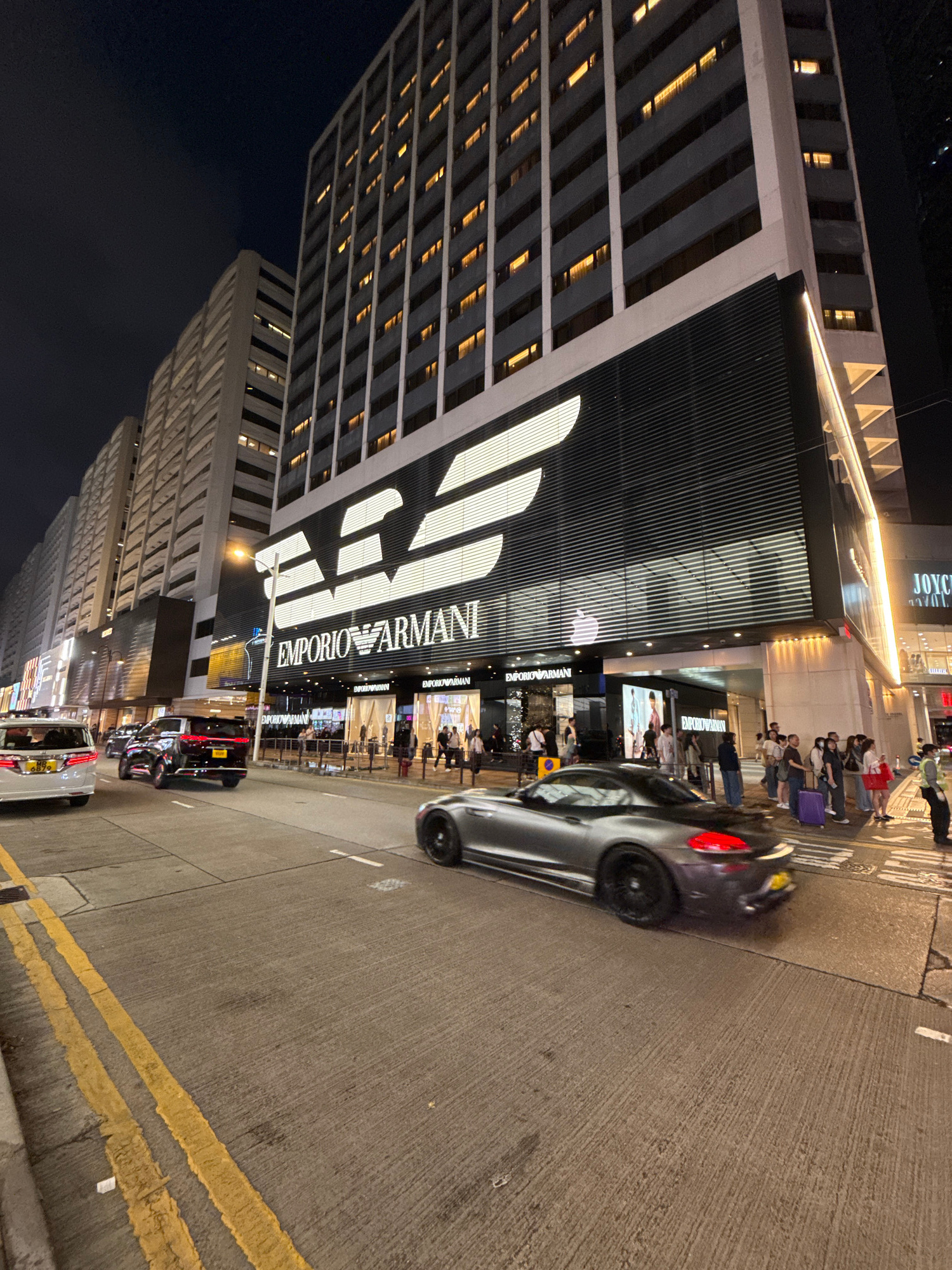 Captured at night, the image presents a tilted view of a city street featuring an Emporio Armani store. The store's prominent signage, adorned with the brand's logo and name in large, illuminated lett…read more