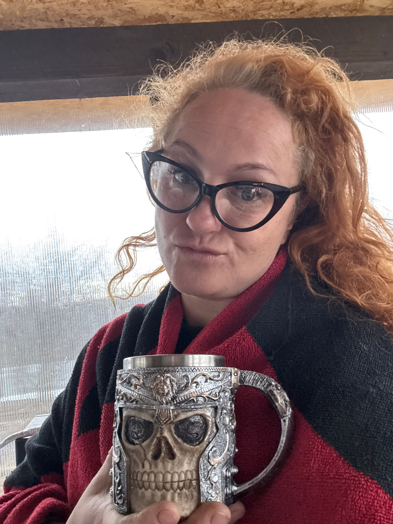 A woman with red curly hair and black-framed glasses is holding a silver mug with a skull design. She is wearing a red and black striped robe. The background appears to be a window or translucent wall…read more