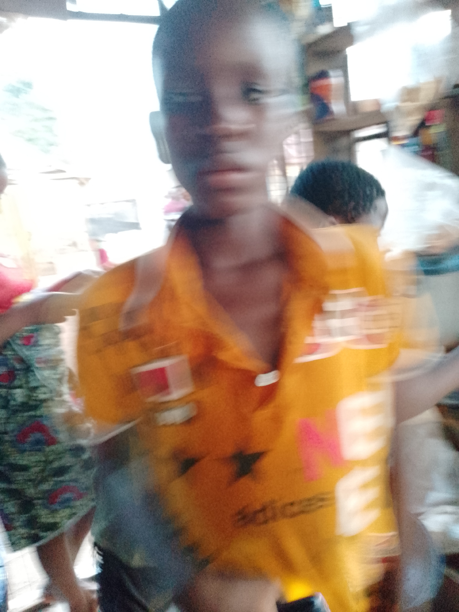 A blurred image depicts a child in Akwanga, Nigeria, wearing an orange t-shirt with pink and white lettering. Another person stands to the left, wearing a patterned skirt and red top. Another person w…read more