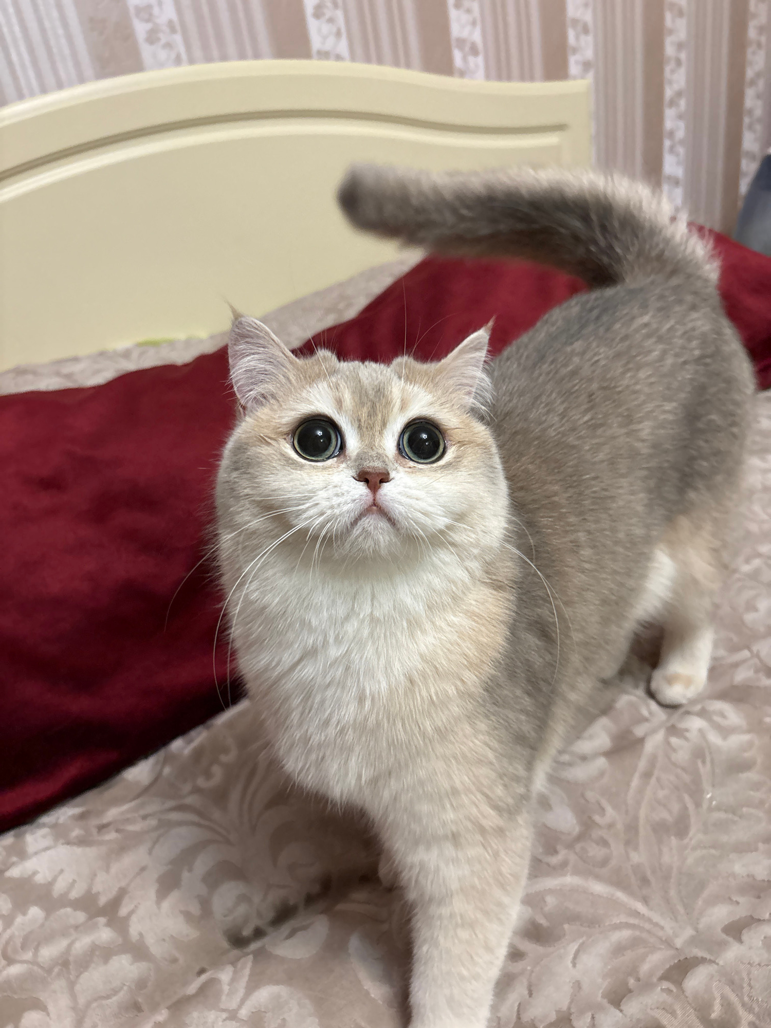 A light grey and white British Shorthair cat lies on a bed. The cat is facing upward with its head tilted slightly to the left. Its large, round, green eyes are wide open and looking directly at the v…read more