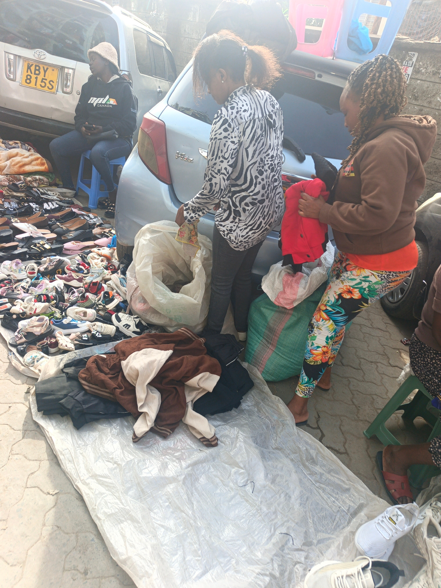 The scene shows a street market in Nairobi, Kenya. Several people are present, presumably buying and selling goods. One woman, wearing a zebra-patterned shirt and jeans, appears to be sorting through…read more