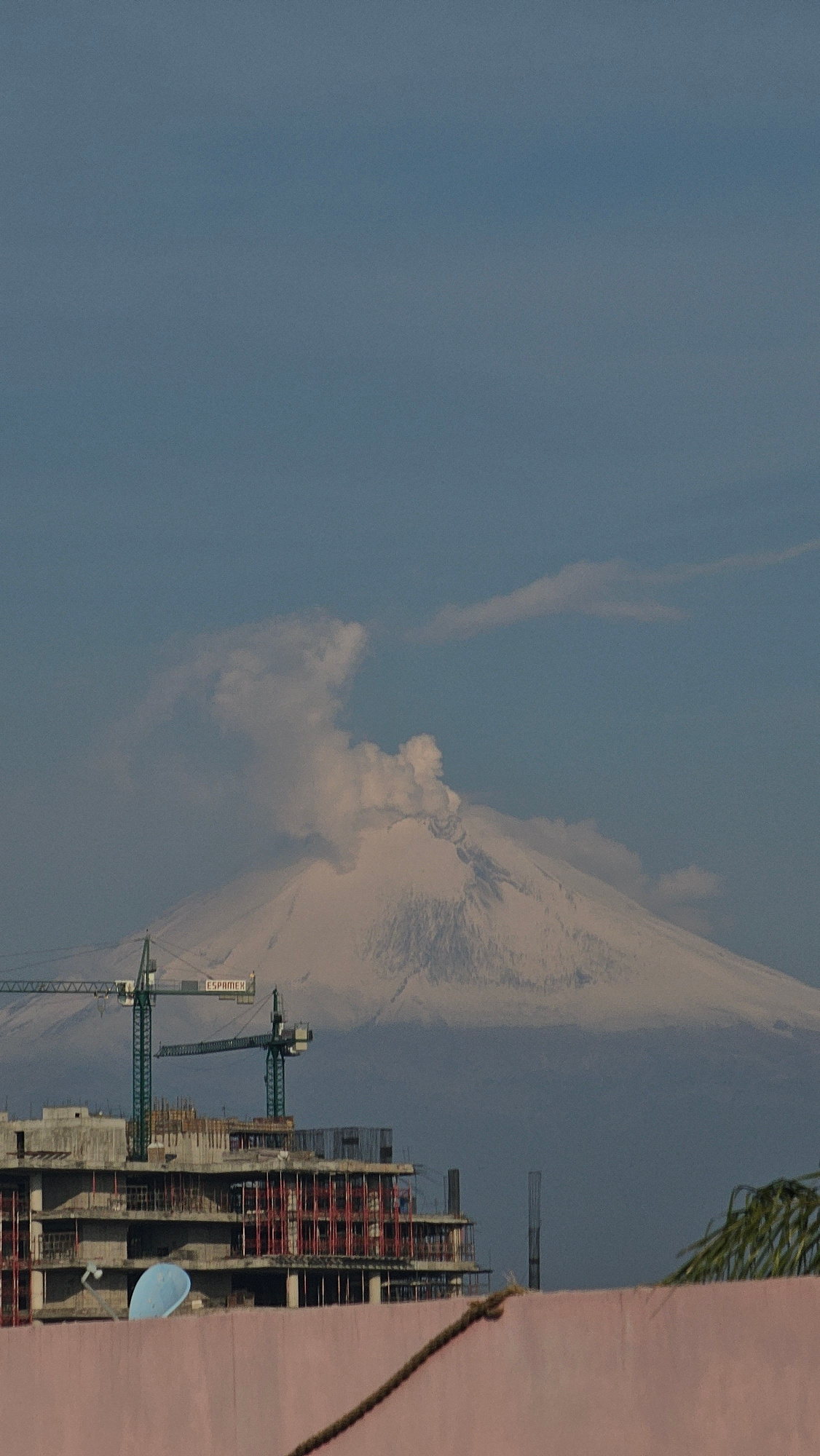 The image depicts a construction site in Puebla, Mexico, situated against a backdrop of the city and a volcano. The scene features high-rise buildings under construction, characterized by scaffolding…read more