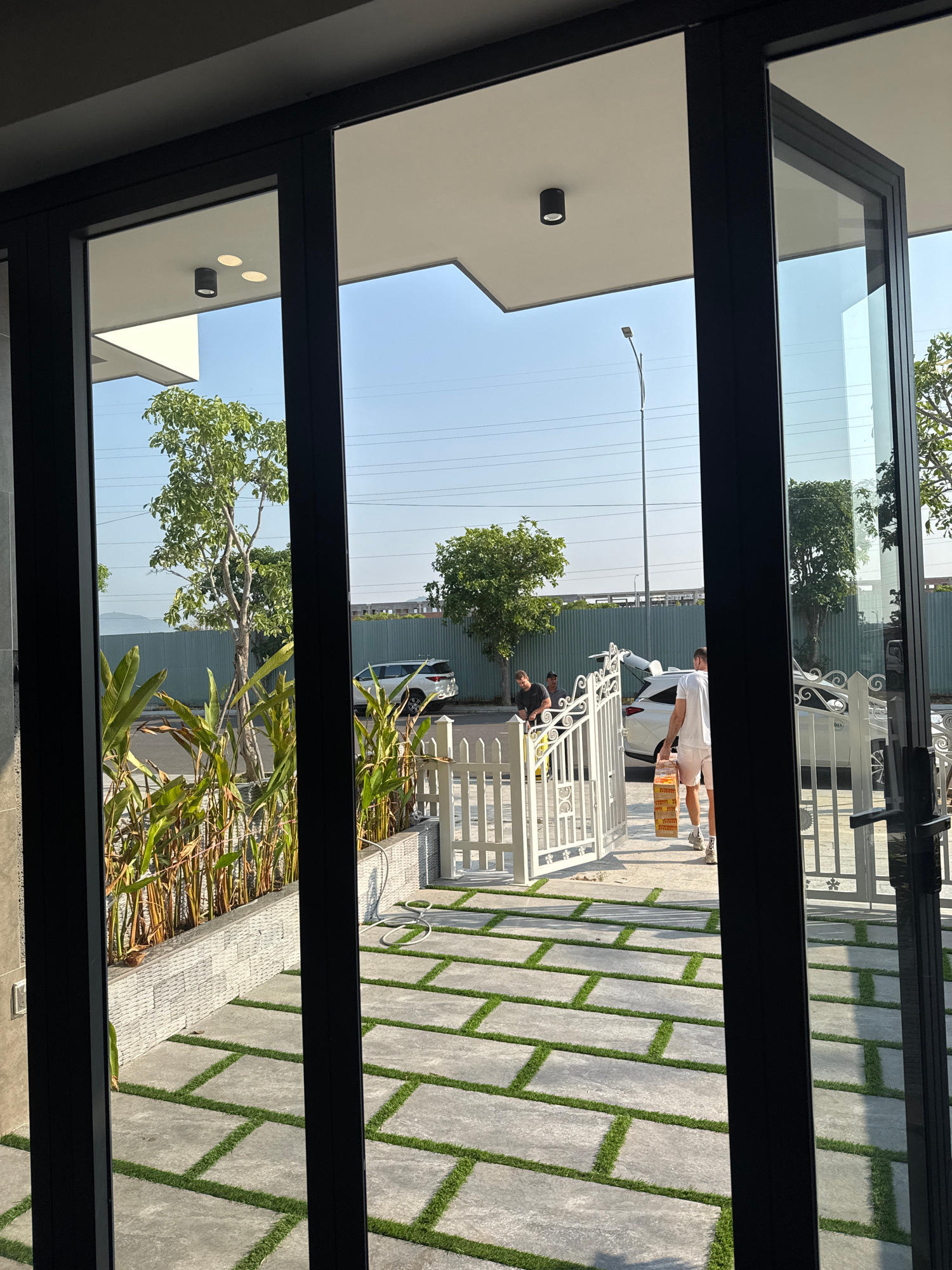 Here's a matter-of-fact description of the image: The image is taken from indoors, looking out through a set of open black-framed glass doors or windows. The view reveals an exterior scene. Two peopl…read more