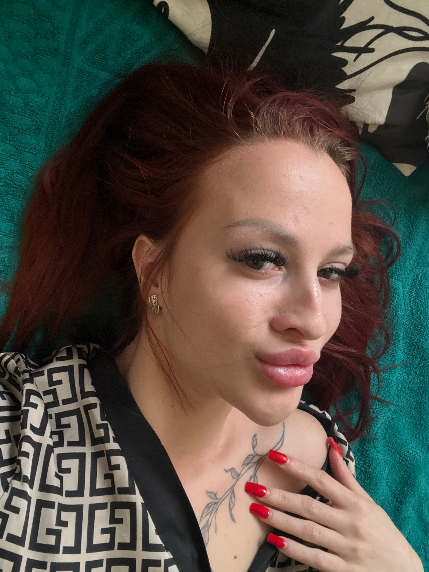 A woman is lying on a green surface, possibly a bed or sofa. She has reddish-brown hair and long red fingernails. She is wearing a black and white patterned top. There is a tattoo on her chest. A patt…read more
