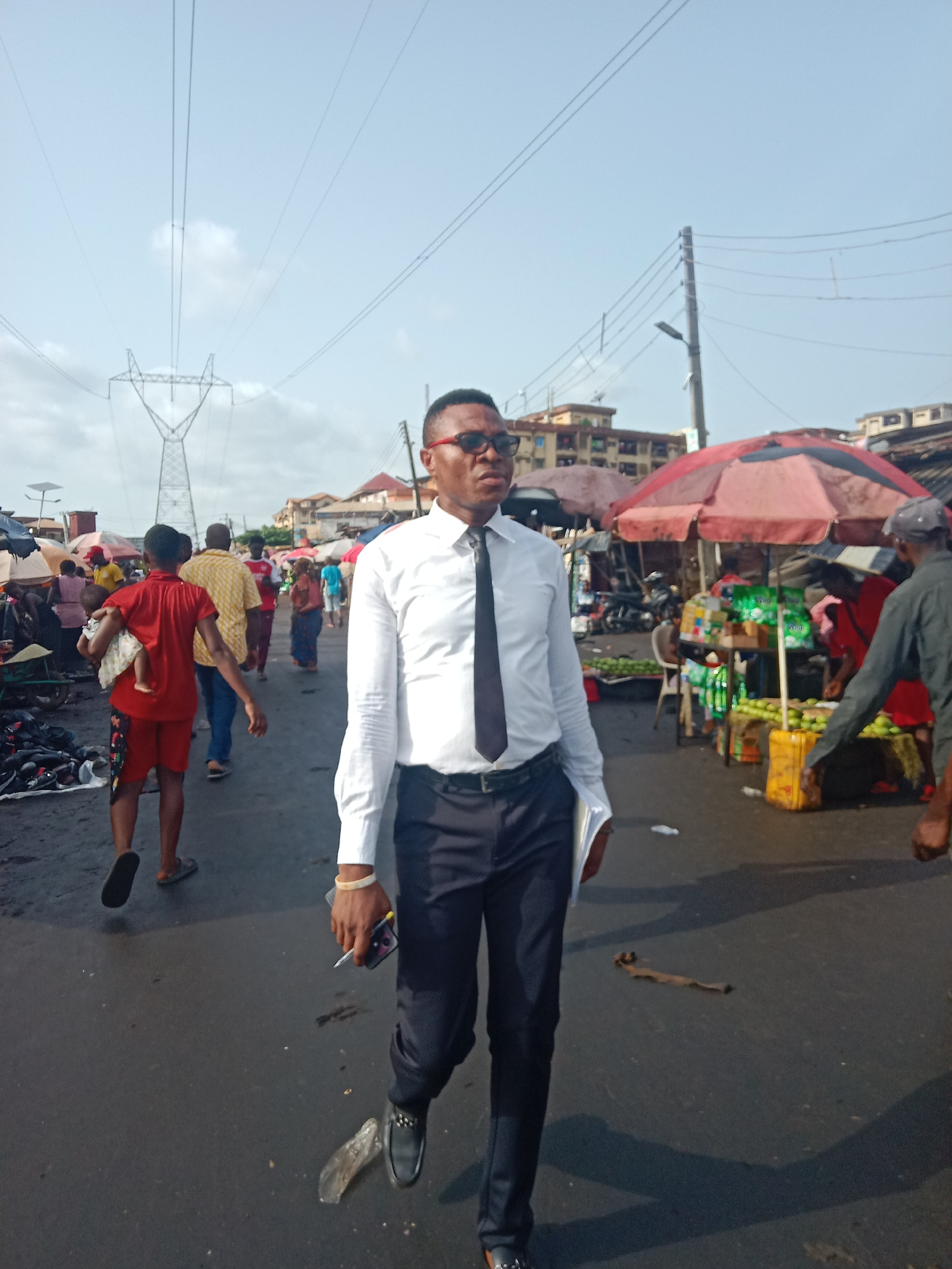 The image shows a man dressed in a white long-sleeved shirt, black tie, and black pants walking in a busy outdoor market. He is wearing dark-rimmed glasses and carrying a phone and possibly a pen or c…read more
