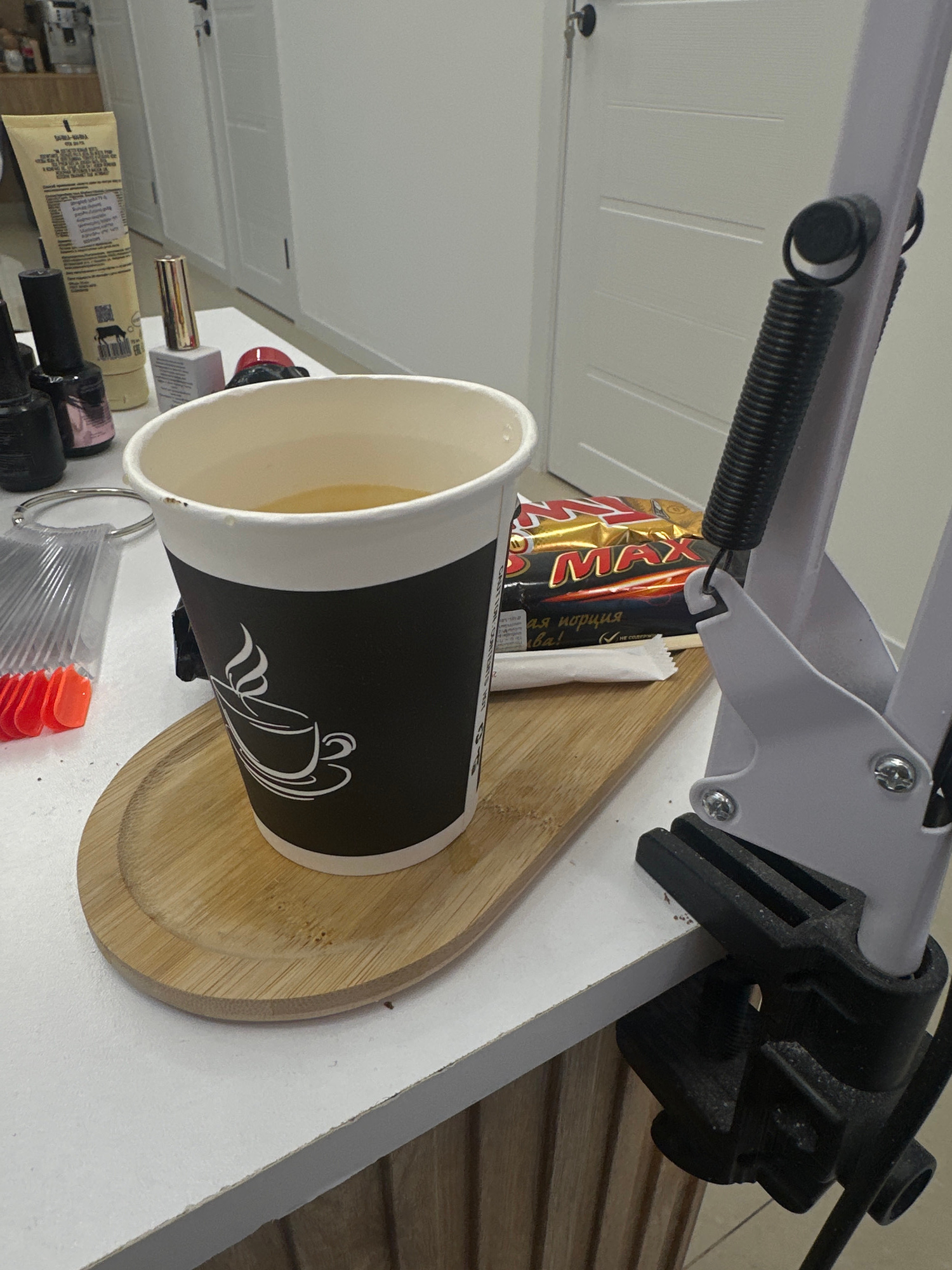 The image shows a white desk with a cup of coffee resting on a wooden tray. Behind the cup are candy bars and a white packet. To the left of the cup are various cosmetics, including nail polish and lo…read more