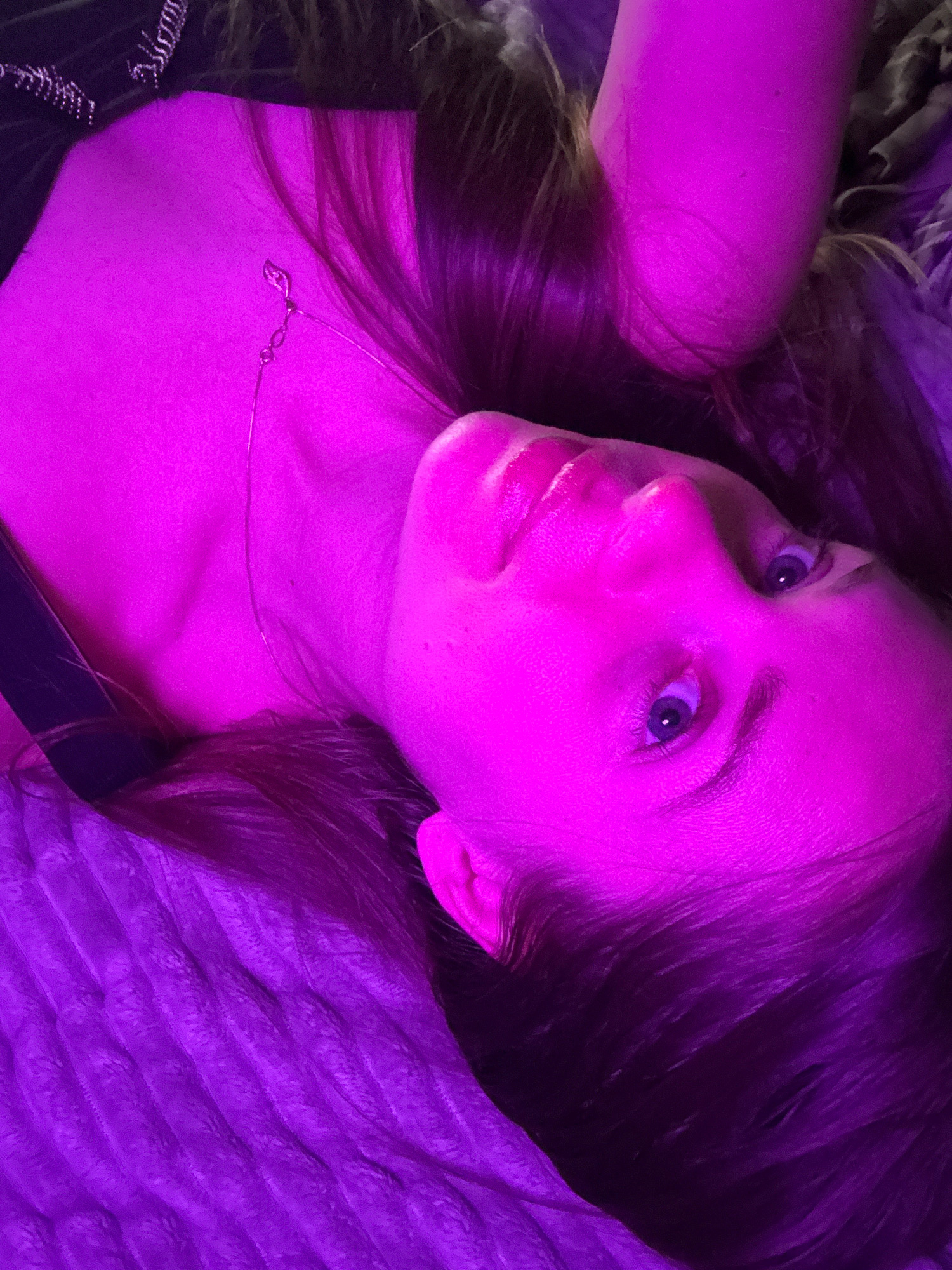 A close-up portrait, taken from a high angle, features a young woman lying down, illuminated by strong magenta-purple lighting that casts a vibrant, uniform hue across the entire scene. Her head is tiβ¦read more