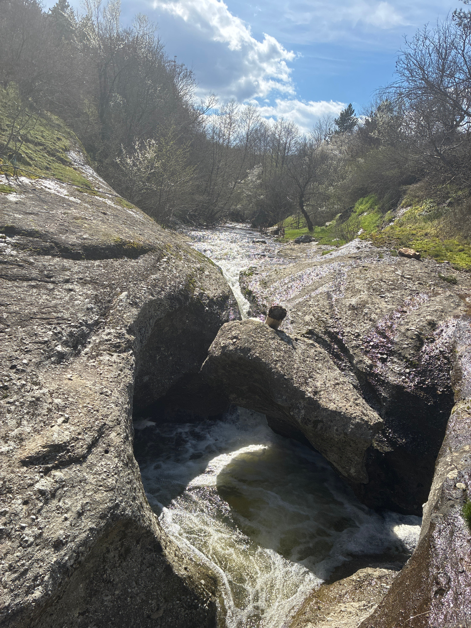The image depicts a cascade of water flowing through a rocky terrain, possibly part of a river or stream. The scene is dominated by large, gray rocks with visible textures and crevices. The water is t…read more