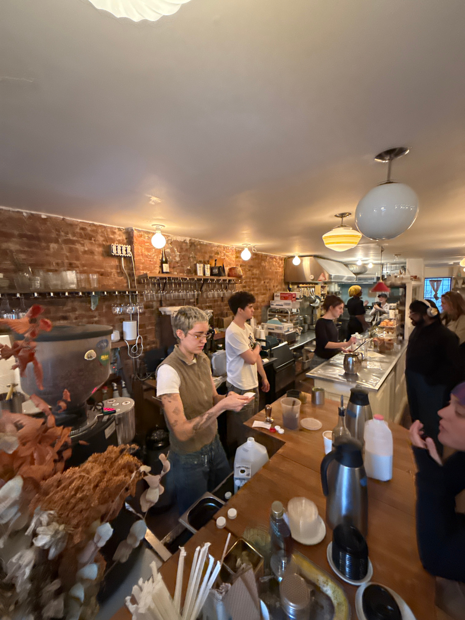 The image shows an interior view of a cafe or restaurant in New York, United States. Patrons stand along a counter, seemingly interacting with the staff. The scene is illuminated by overhead lighting…read more