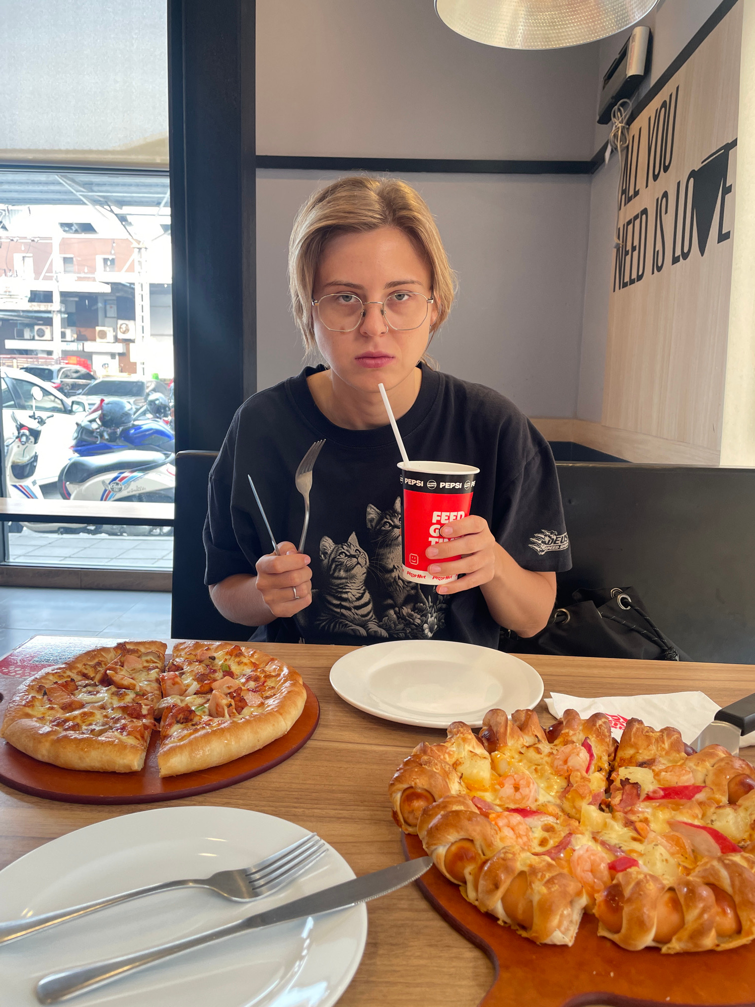 The image depicts a woman seated at a wooden table in an indoor restaurant setting, likely a pizza parlor, with a large window offering a view of an urban street. The woman, with short blonde hair and…read more