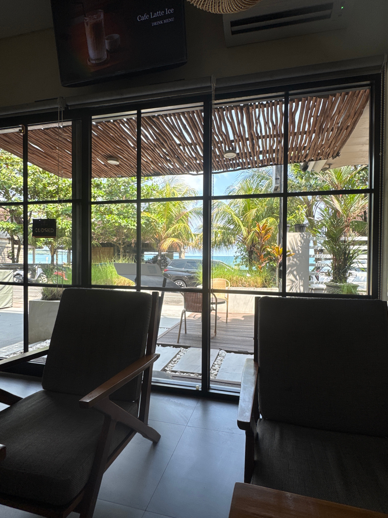 View from an indoor seating area of a cafe in Kuta, Indonesia, looking out through a multi-paned window. The foreground includes two dark chairs, one positioned to the right and one towards the bottom…read more