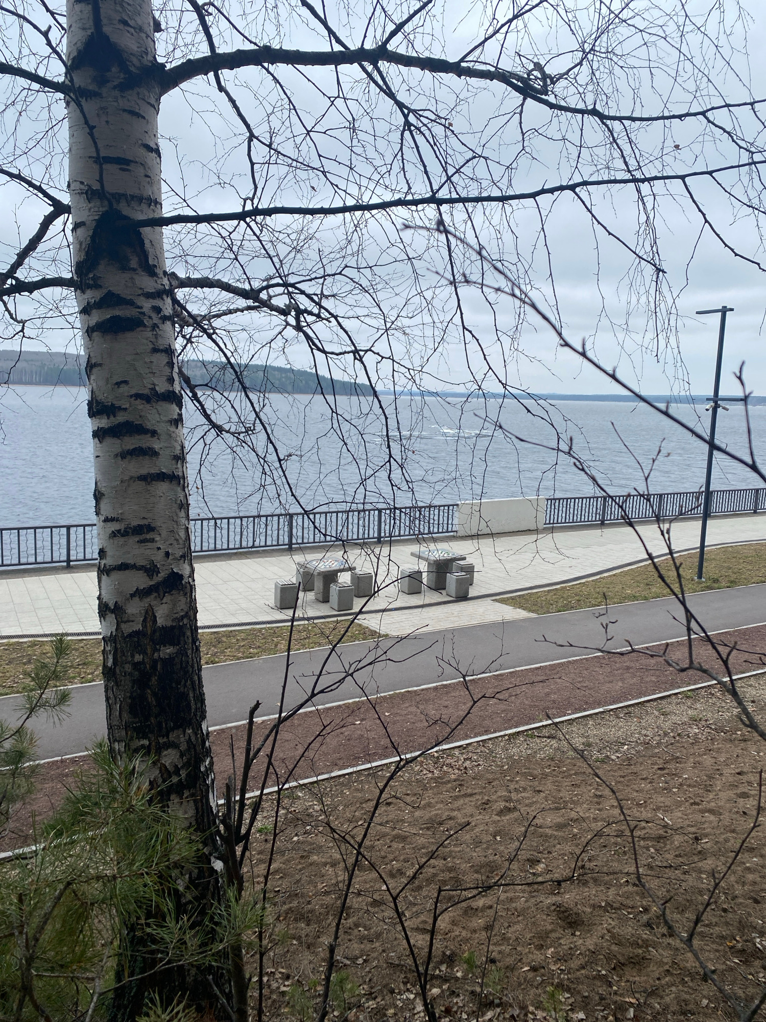 The image captures a tranquil waterfront scene in Chaikovsky, Russia, likely during early spring or late autumn, under an overcast sky. A large birch tree trunk, with its characteristic white and blac…read more