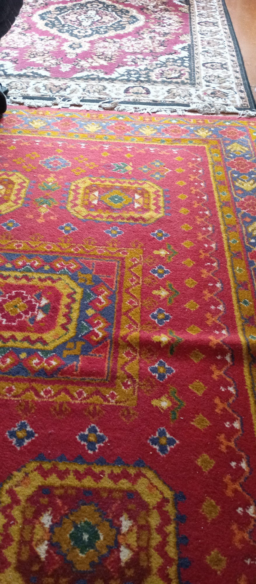The image shows two rugs stacked on top of each other. The larger rug, primarily red, is positioned at the bottom of the frame and features an intricate geometric pattern with yellow, blue, and green…read more