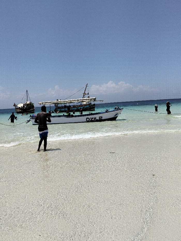 The image depicts a coastal scene on Wasini Island, Kenya, under a clear blue sky with scattered white clouds. In the foreground, a light-colored sandy beach extends into shallow, clear turquoise wate…read more