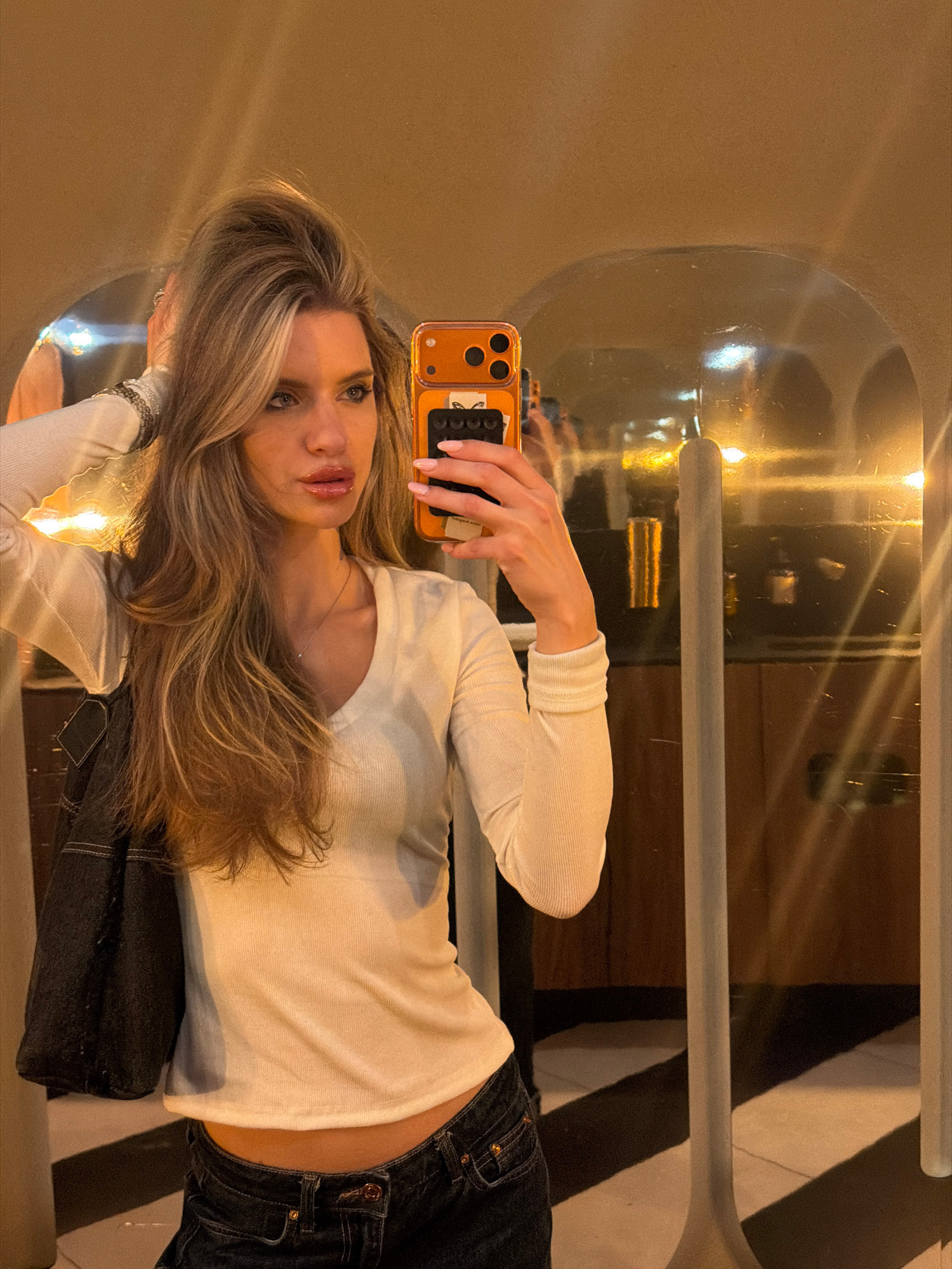 A young woman with long, blonde hair is taking a selfie in a mirror. She is wearing a white long-sleeved shirt and dark jeans. A black jacket is visible behind her. The mirror is part of a semi-circul…read more