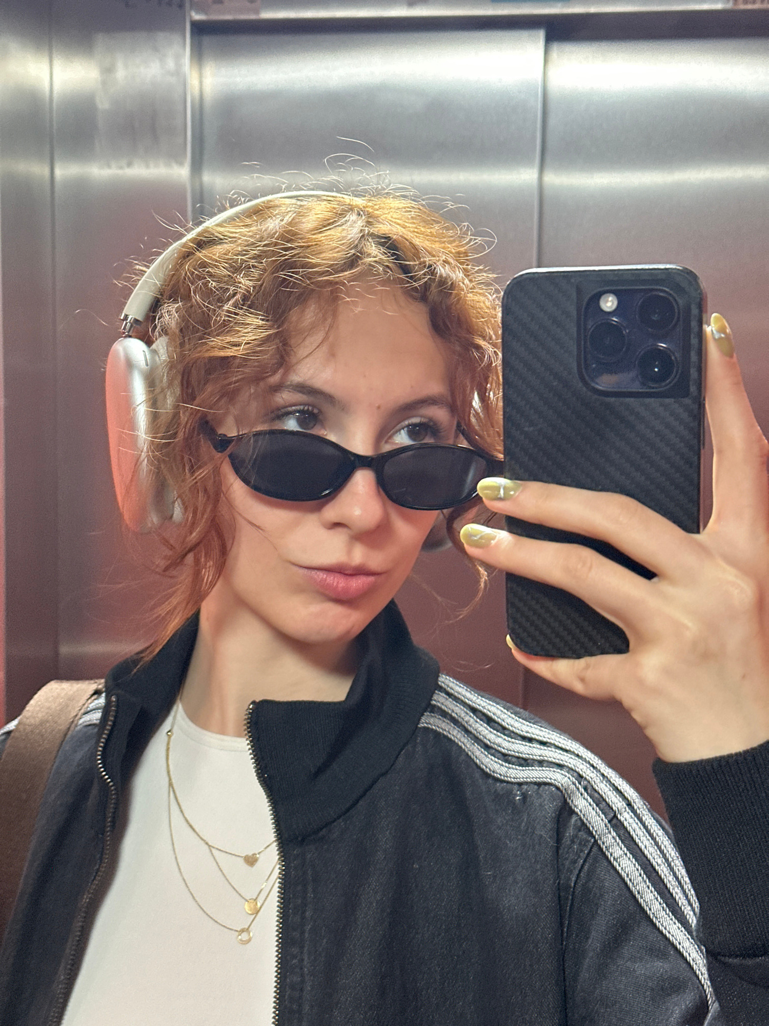 The image is a mirror selfie, rotated 90 degrees counter-clockwise, featuring a young individual with curly, reddish-brown hair. They are wearing black rectangular sunglasses that cover part of theirβ¦read more