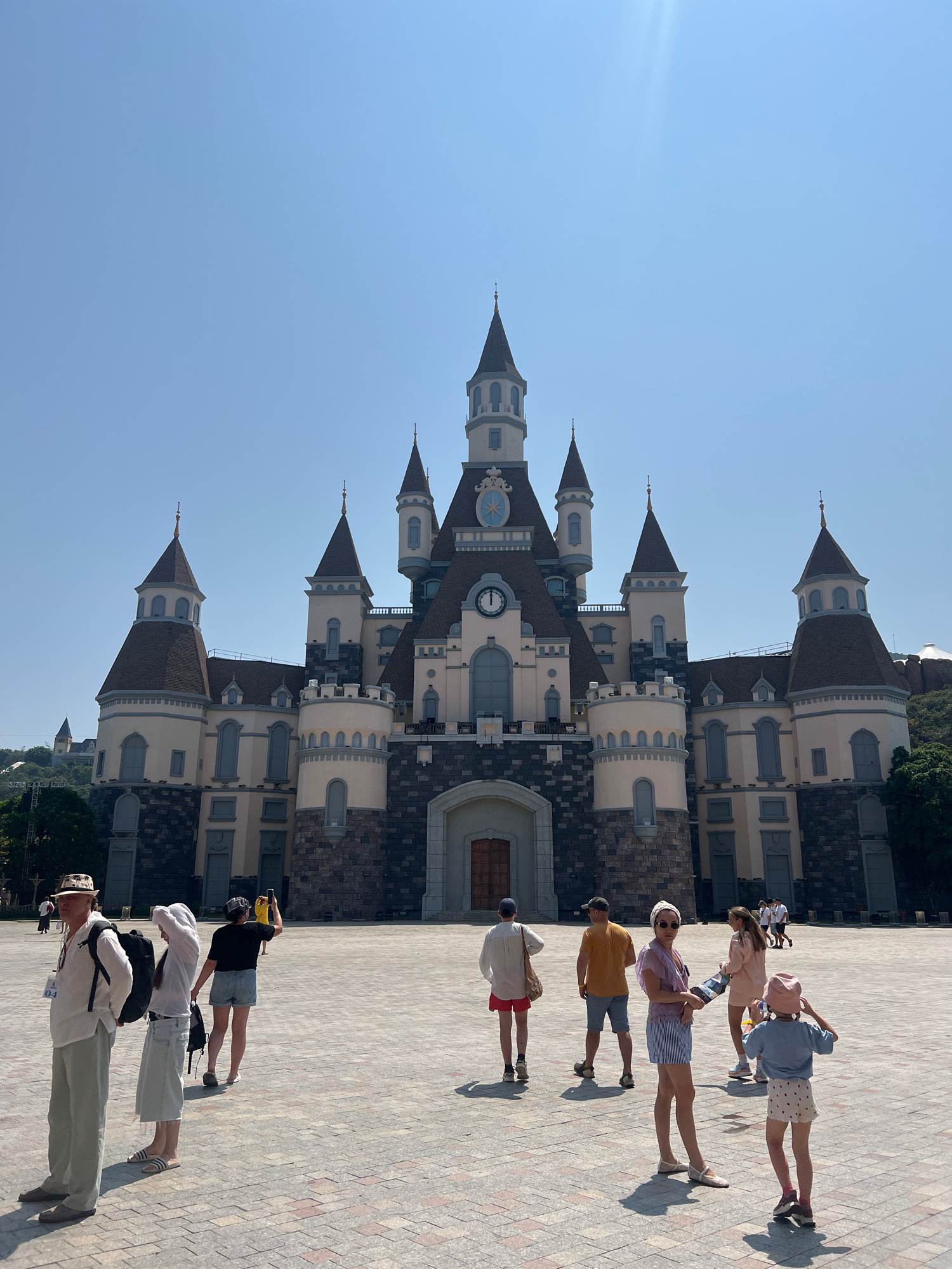 The image depicts a group of people standing in front of a large castle. The castle is multi-layered with multiple towers and spires. It has a predominantly light beige exterior, accented with brown a…read more