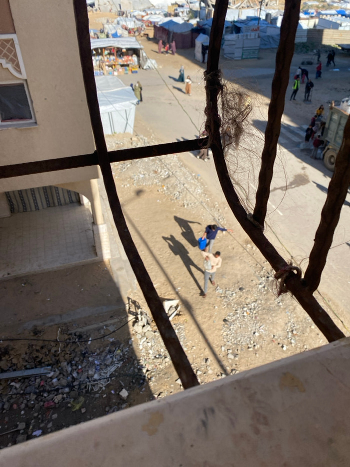 A high-angle shot, potentially from a window or balcony, shows a street scene. Two men are walking together, one in a blue shirt. A market area is visible in the distance, with white tents and people.…read more