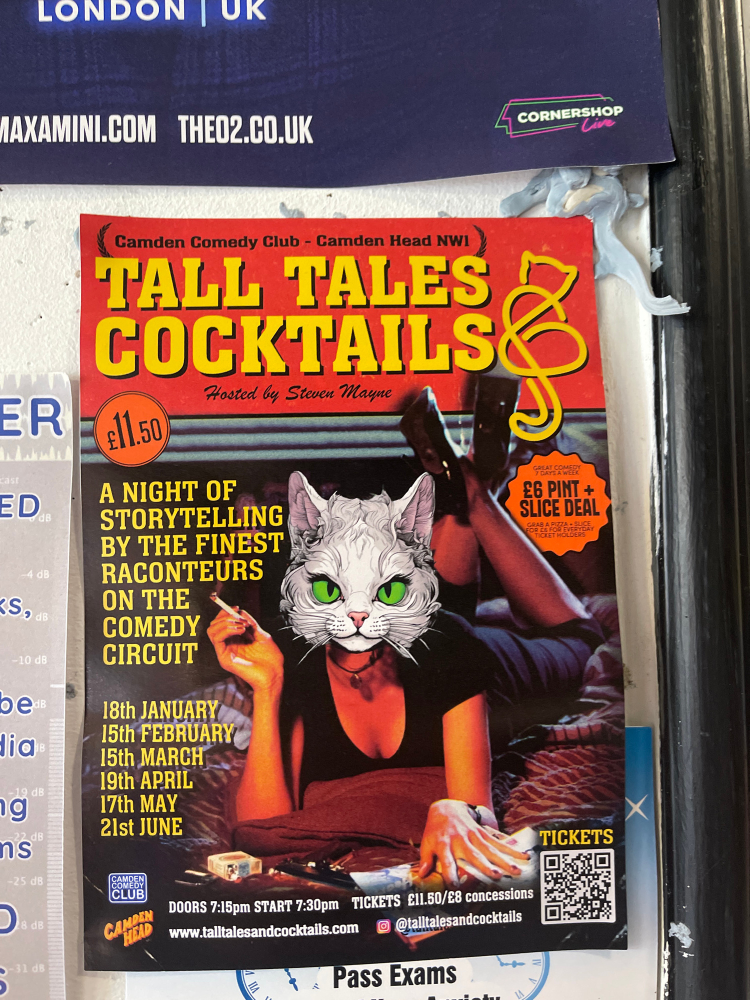 This image captures multiple overlapping posters, primarily featuring a vertically oriented advertisement for an event titled "Tall Tales & Cocktails." The main poster, photographed sideways, displays…read more