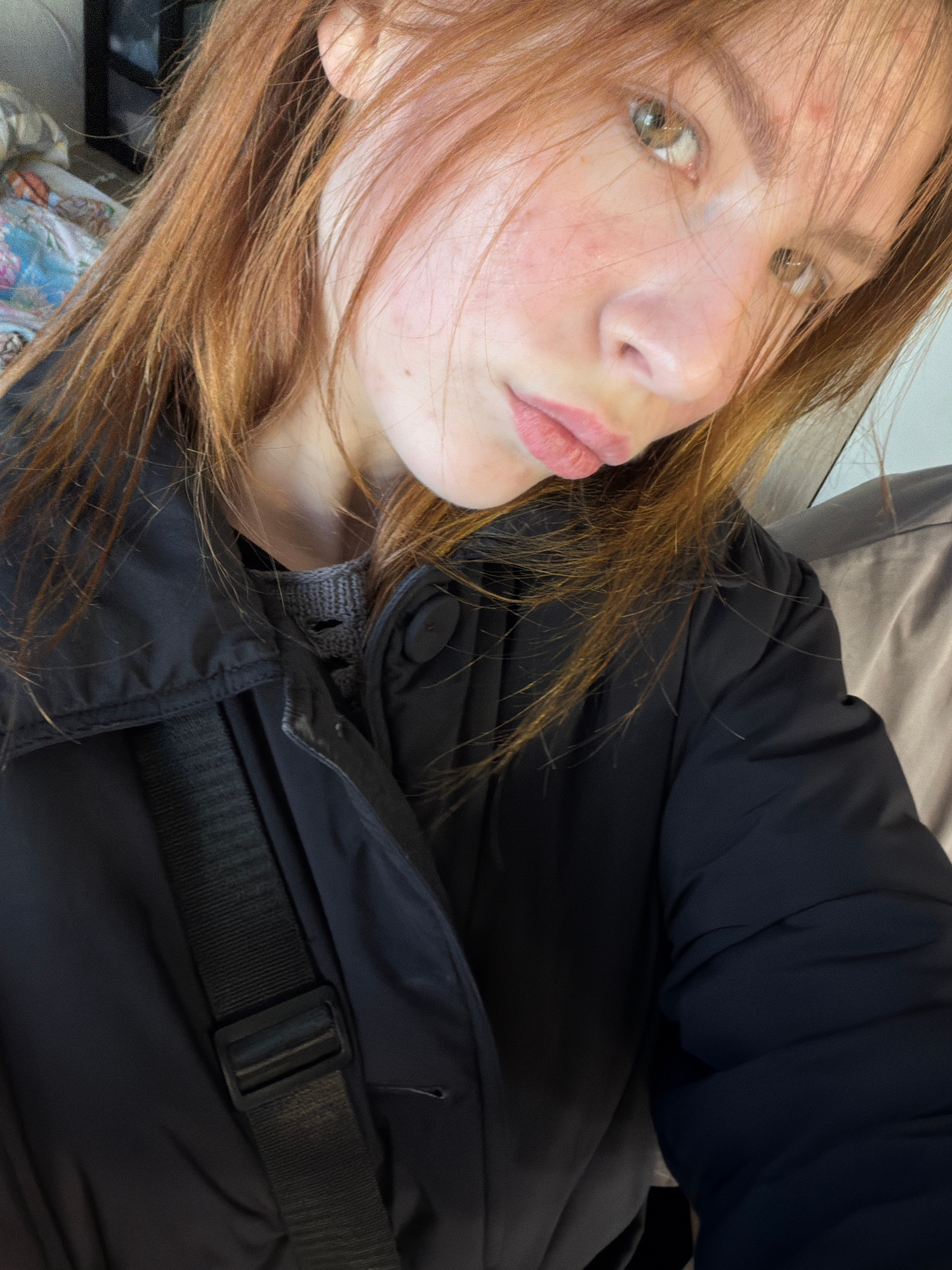 A young woman with light brown hair and fair skin is wearing a black jacket. The jacket has a strap across the chest. The woman is looking towards the camera with a slight tilt of her head. The backgr…read more