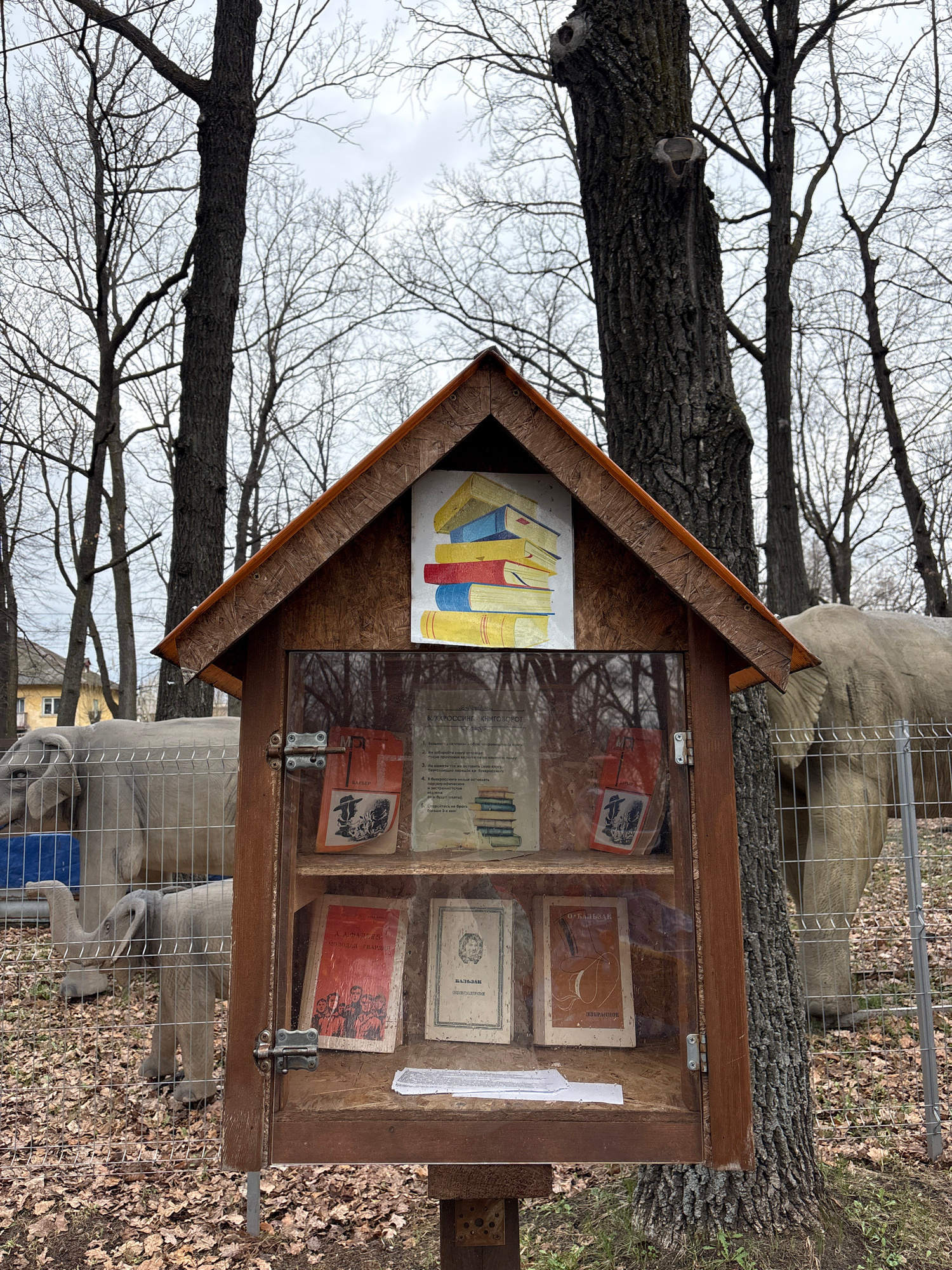 A small, wooden, house-shaped "Little Free Library" stands outdoors in Ulyanovsk, Russia. The library is affixed to a metal pole and positioned beneath trees with bare branches against a cloudy sky. T…read more