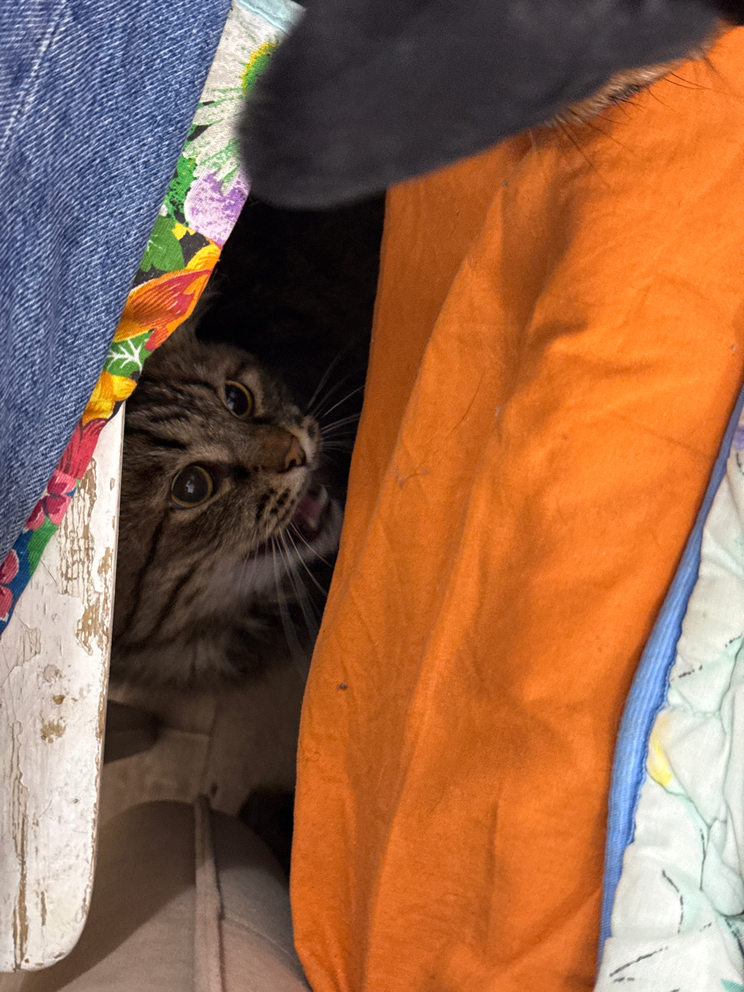 A tabby cat is partially visible between folded laundry. The laundry consists of an orange fabric, a patterned fabric with blue, purple, orange, and green elements, a blue denim fabric, and a white fa…read more
