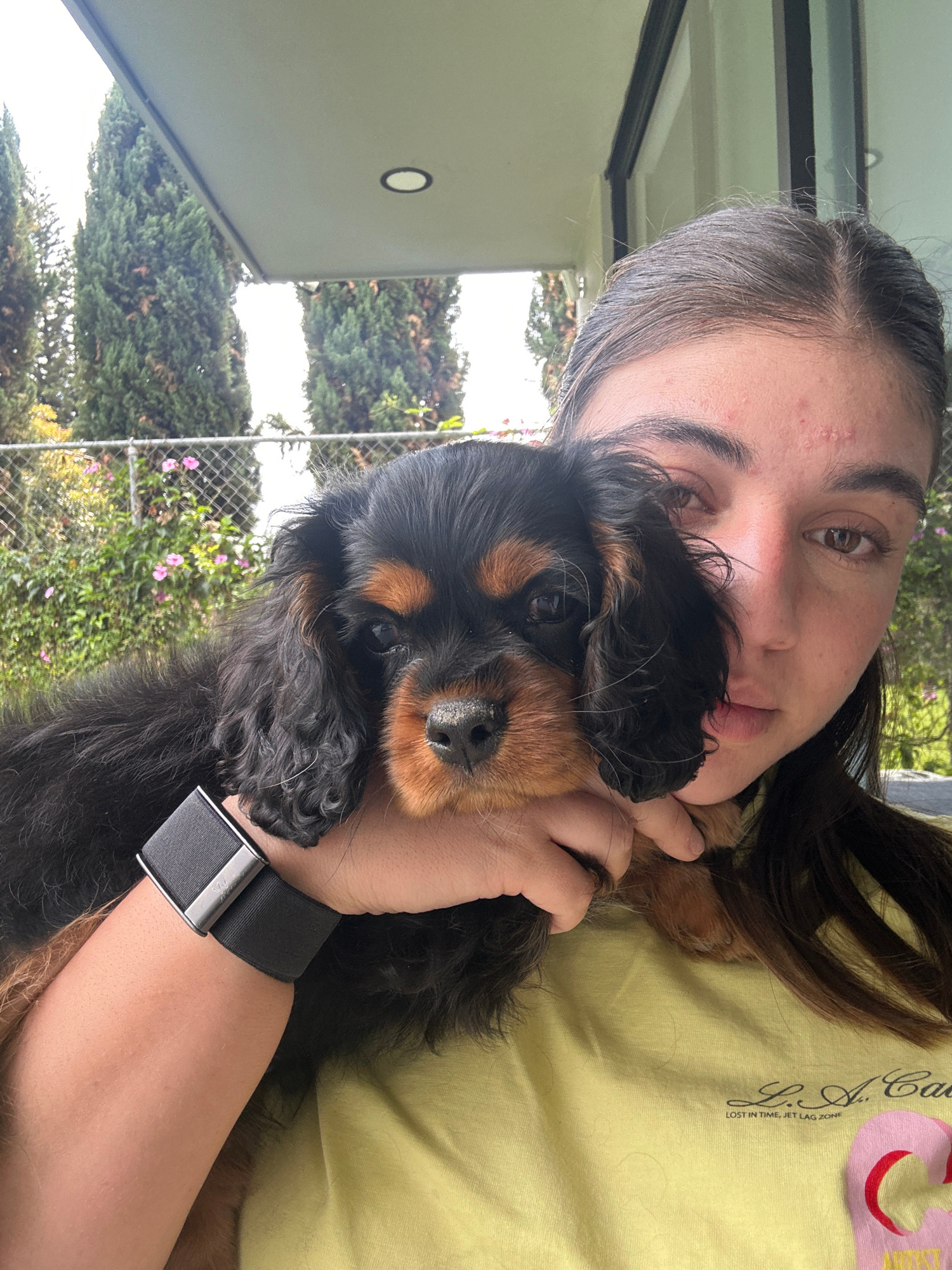 A woman with brown hair holds a black and brown Cocker Spaniel puppy close to her face. She has brown eyes and light skin. She wears a yellow t-shirt. A black smartwatch is visible on her left wrist.…read more