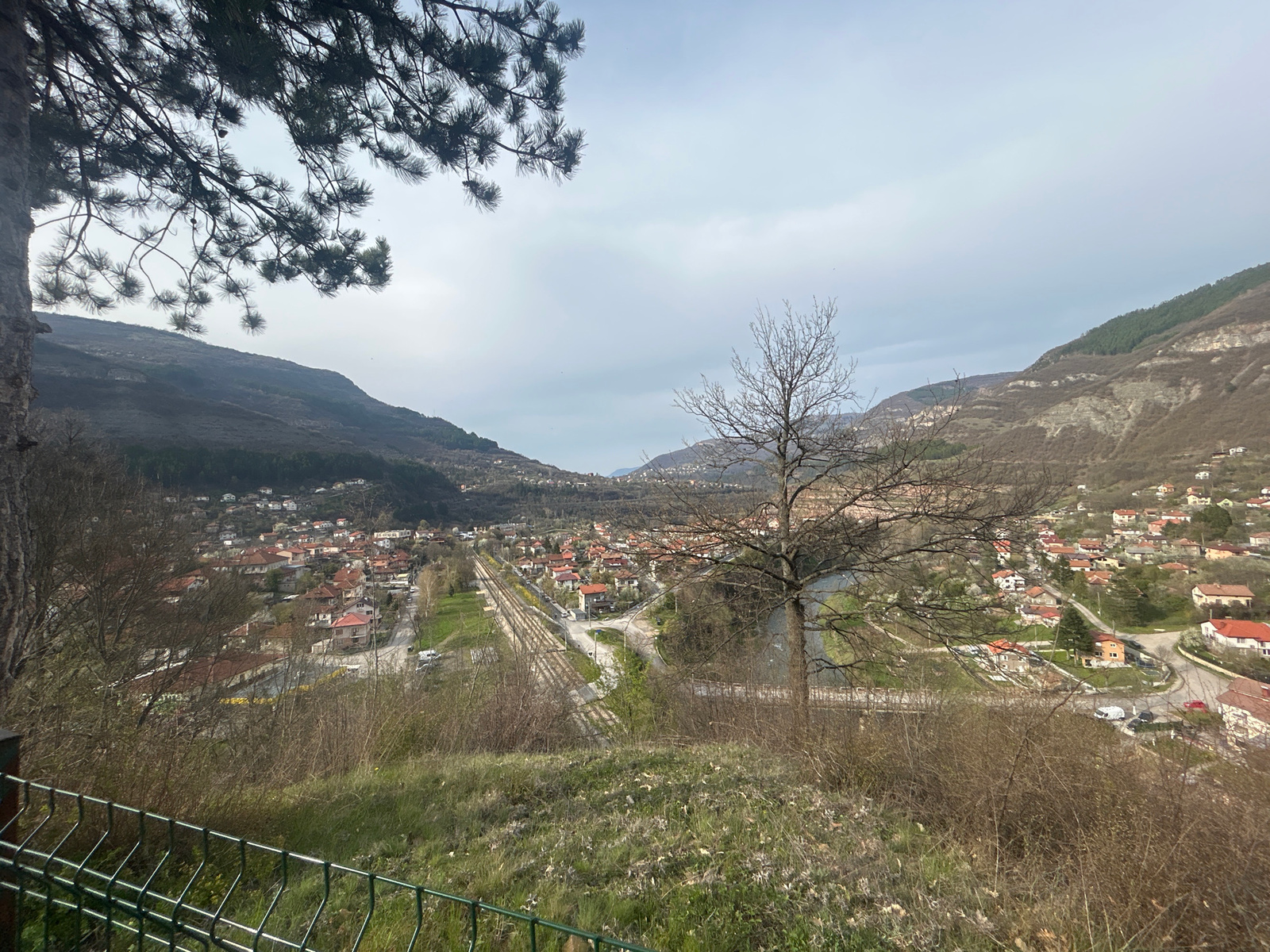 A wide-angle shot from a hillside reveals a panorama of the village of Tserovo, Bulgaria, nestled in a valley. Two mountains enclose the valley. A tree with bare branches stands prominently to the rig…read more
