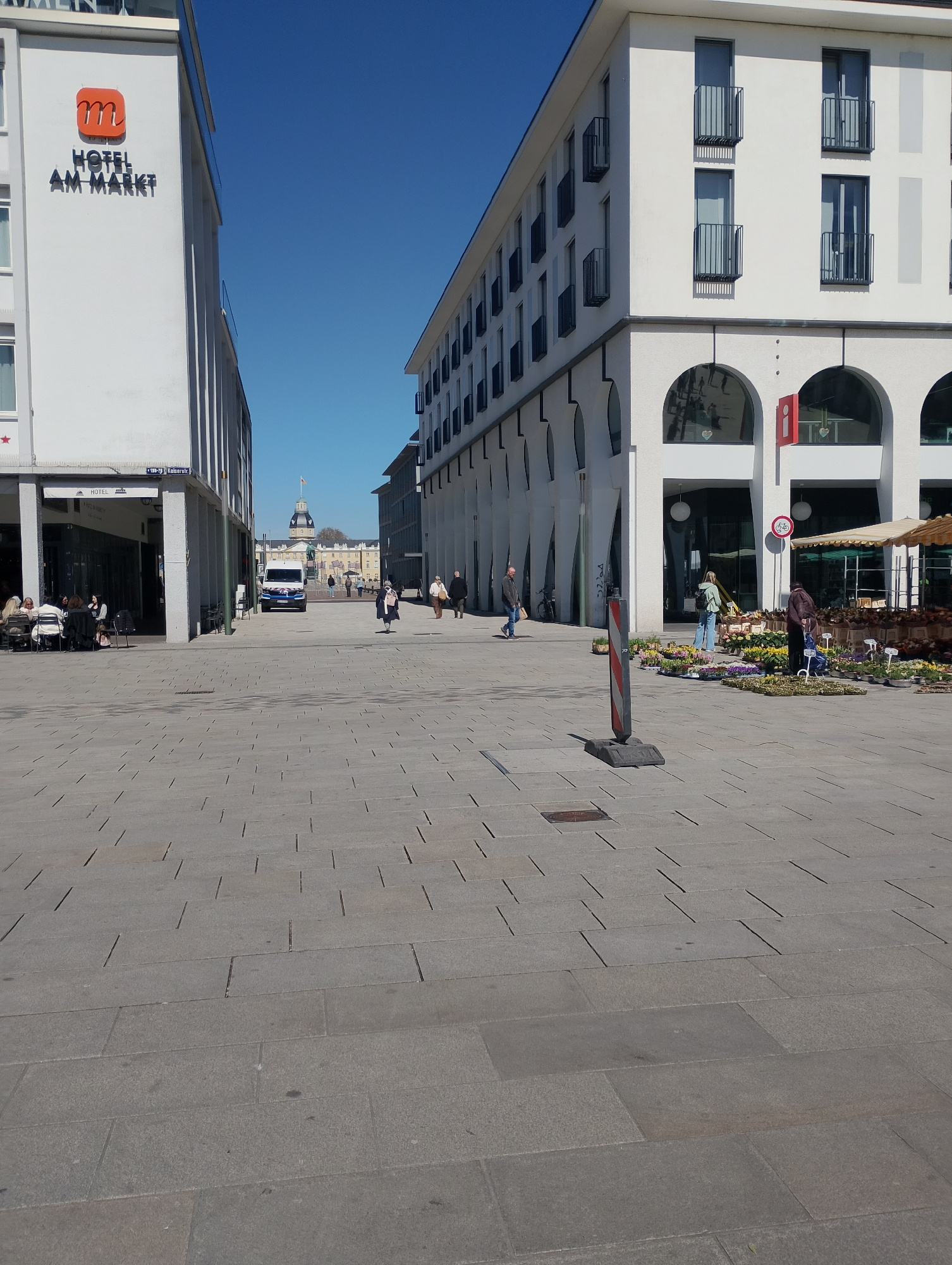 This is an outdoor scene in Karlsruhe, Germany. The image shows a wide pedestrian street paved with gray rectangular stones. On the left is a building with a white facade. A sign reading "HOTEL AM MAR…read more