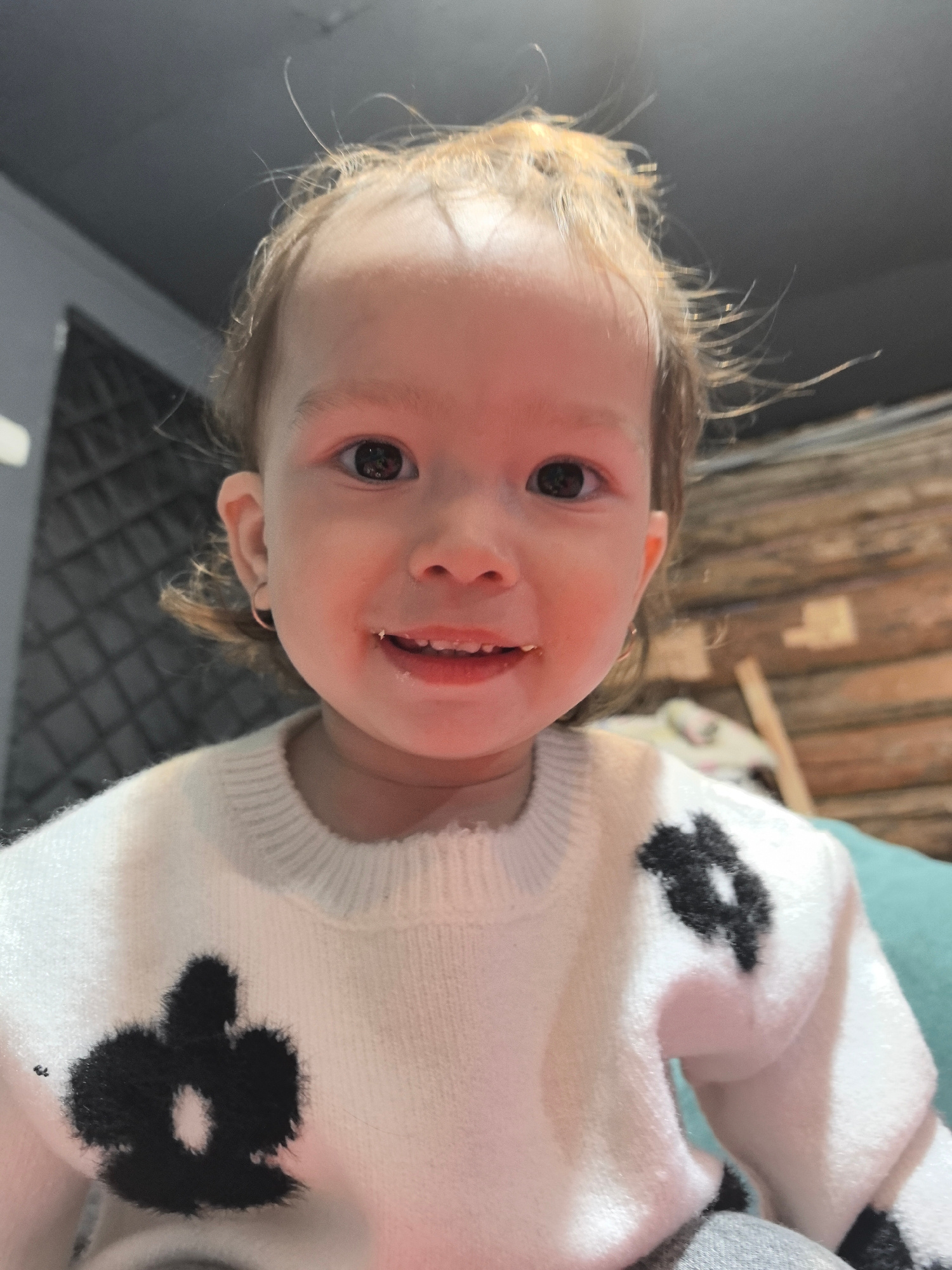 The image displays a young child with fair skin, light brown or blonde wispy hair, and dark eyes, looking directly at the camera with a smile. A small silver hoop earring is visible in the child's lef…read more