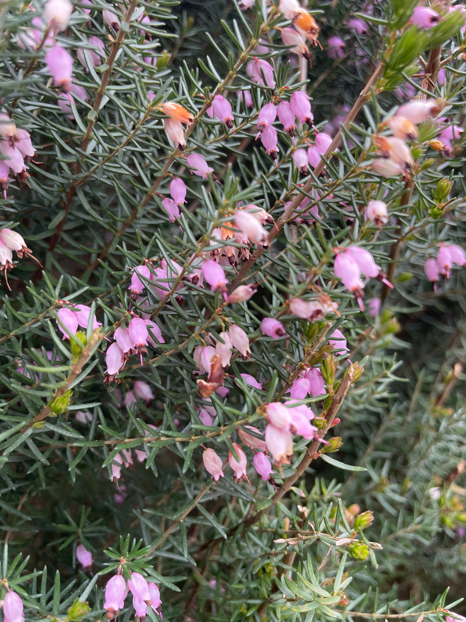 The image depicts a close-up of a flowering plant with needle-like leaves and small, pink, bell-shaped flowers. The leaves are a muted green-gray color, and the flowers are a soft, pale pink. Some flo…read more