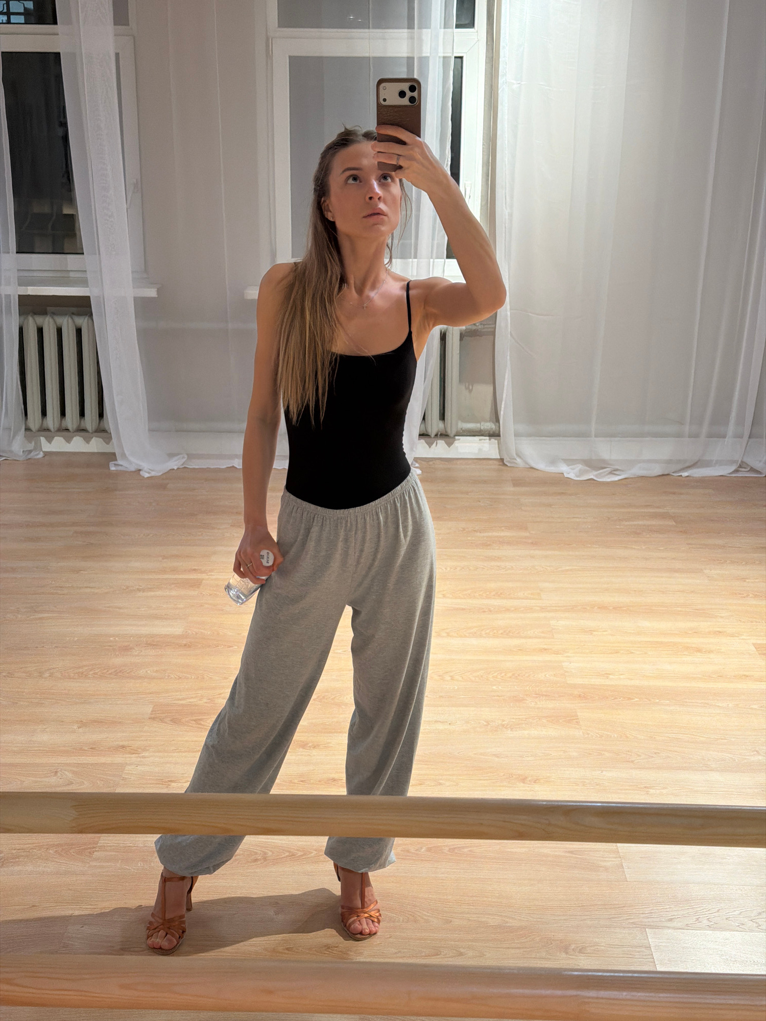 A full-length image shows a woman in a black tank top and grey sweatpants taking a selfie with a cell phone. She is holding a water bottle in her other hand. She is wearing sandals. The room is bright…read more