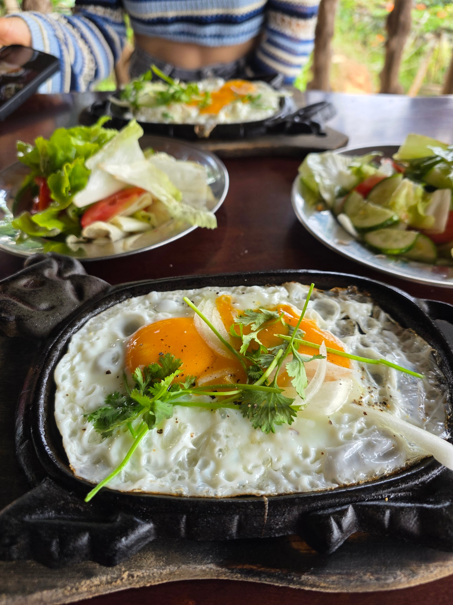 This media file captures a close-up, high-angle view of a meal being served outdoors during the daytime in Sơn Điền, Vietnam. The central focus is a black cast-iron sizzling plate holding a fried egg…read more