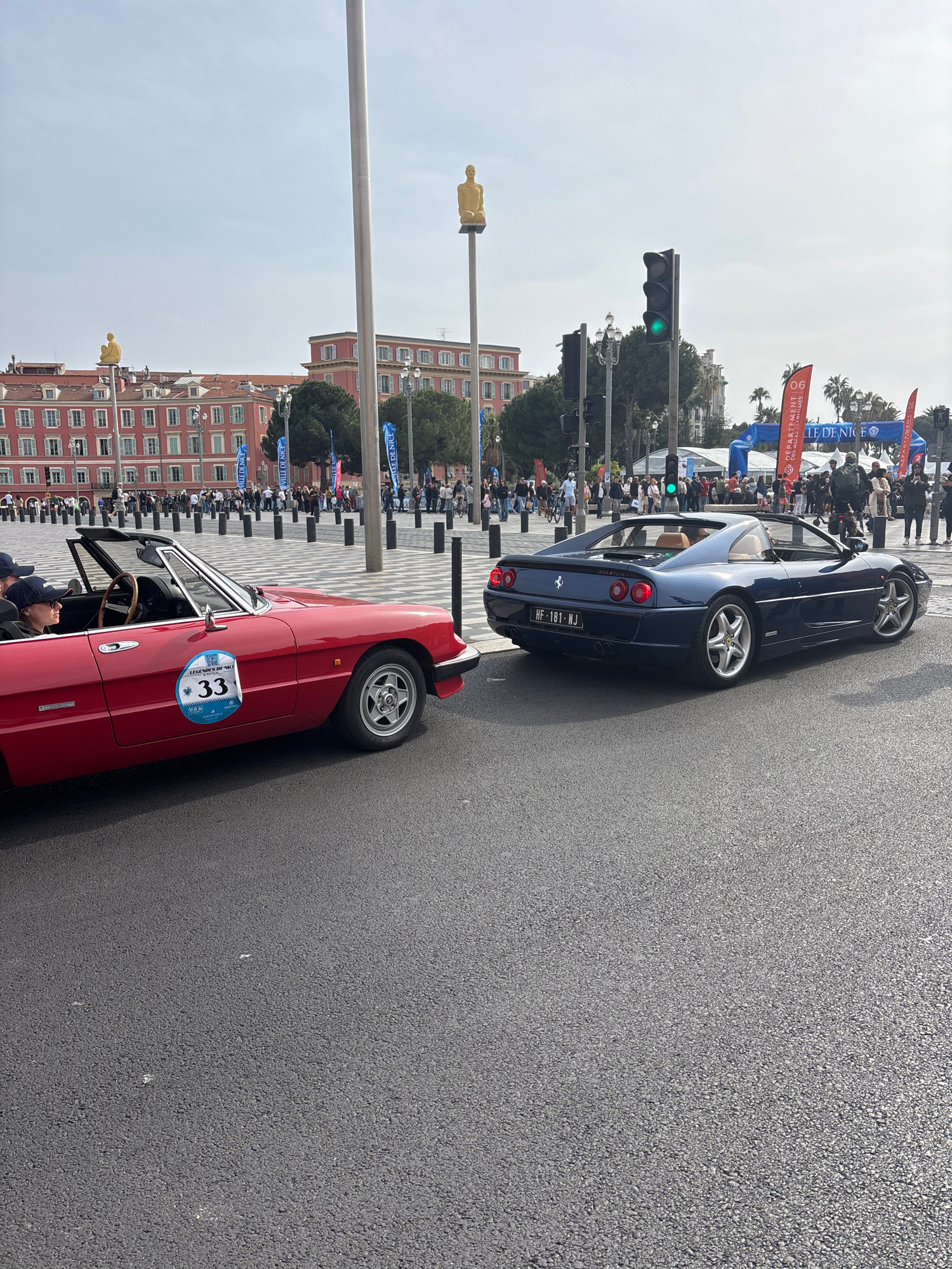 The image shows a street scene in Nice, France, featuring a red vintage convertible car with a '33' race number sticker parked next to a dark blue modern Ferrari. Pedestrians line the sidewalks, and b…read more