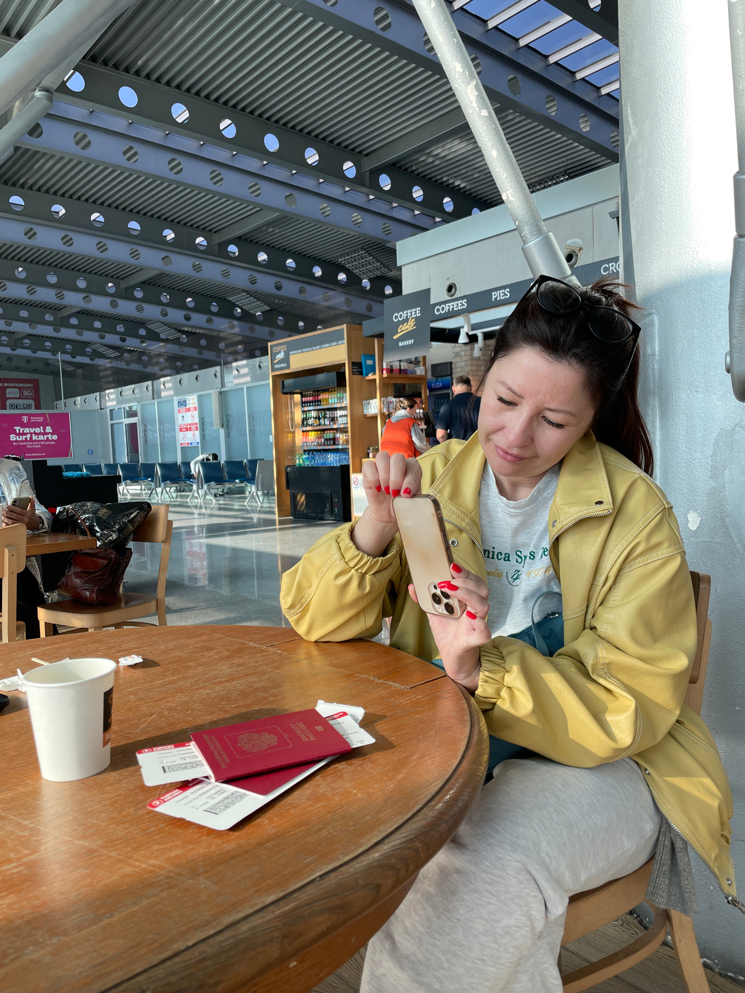 A woman in a yellow jacket and grey sweats sits at a wooden table, using a smartphone. On the table are two burgundy passports, airline tickets, and a white coffee cup. Behind her are shops and seatin…read more