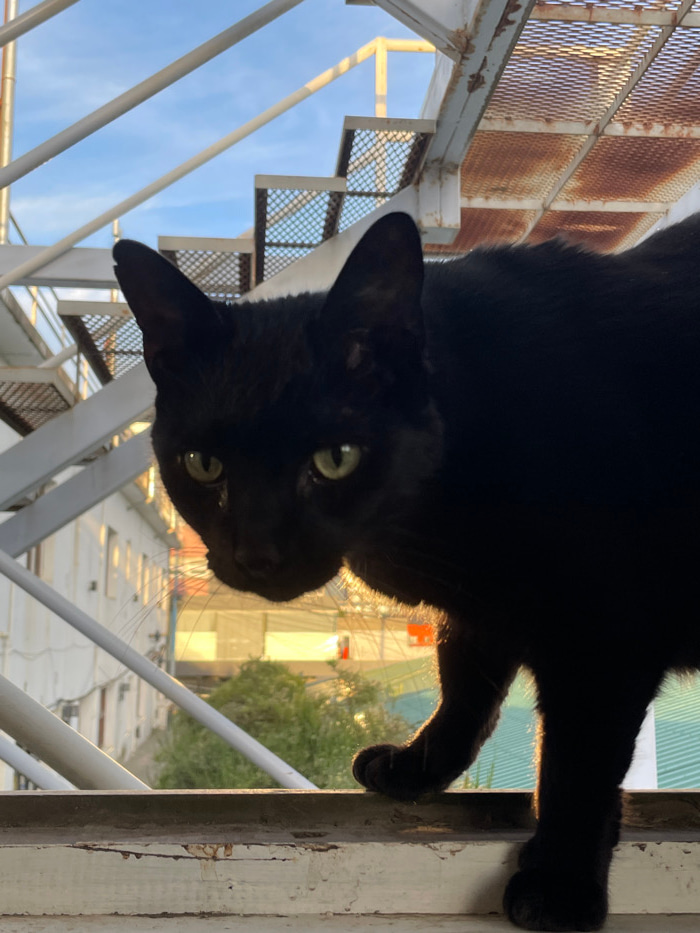 A black cat hangs upside down, looking directly at the camera with its green eyes. The cat's paws grip a white, weathered railing. Behind the cat, an industrial-looking metal staircase rises against a…read more