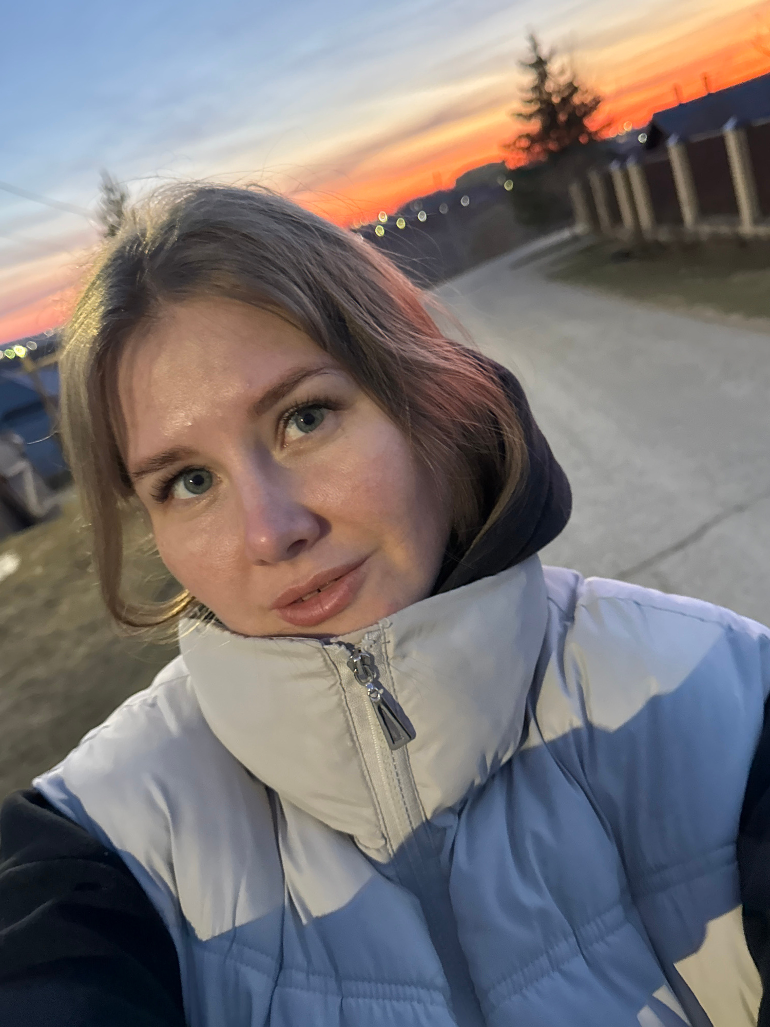 The media file is a close-up, slightly tilted selfie of a young woman taken outdoors during twilight in Горный, Russia. The woman is positioned centrally, looking directly at the camera with a calm ex…read more