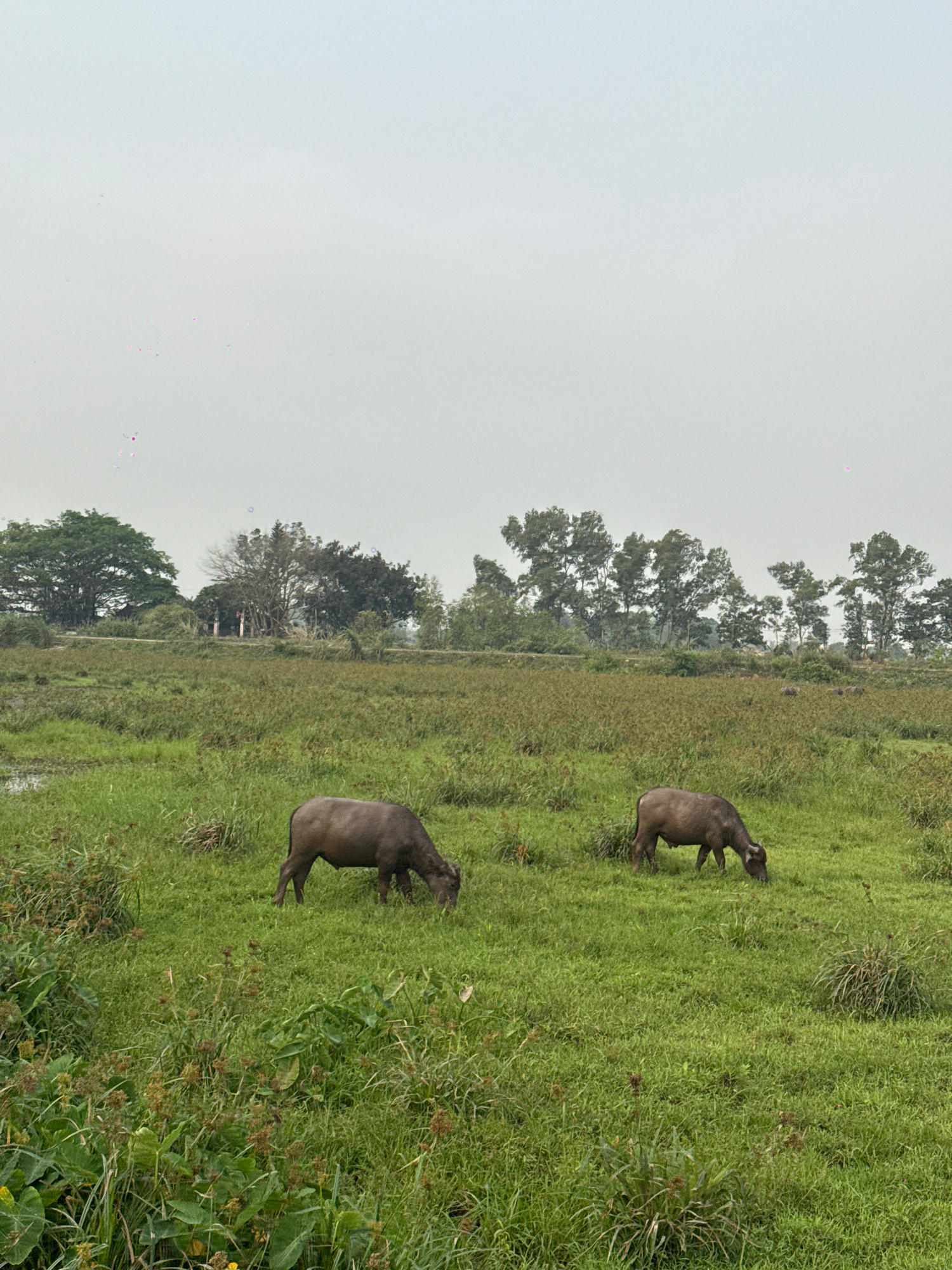 Two water buffalo graze in a lush, green field under an overcast sky in Nam Hoa Lư Ward, Vietnam. Trees line the horizon behind the field.