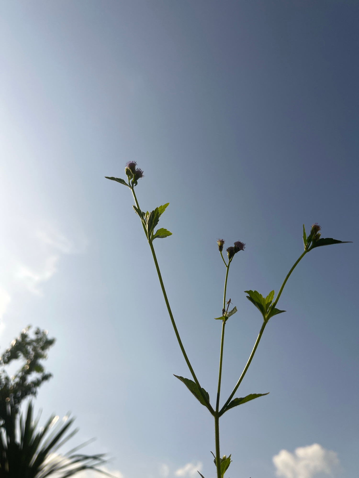 The media file displays a close-up, low-angle shot of a plant stem adorned with small, purplish blossoms and green leaves, set against a vast, light blue sky. The main stem of the plant angles diagona…read more