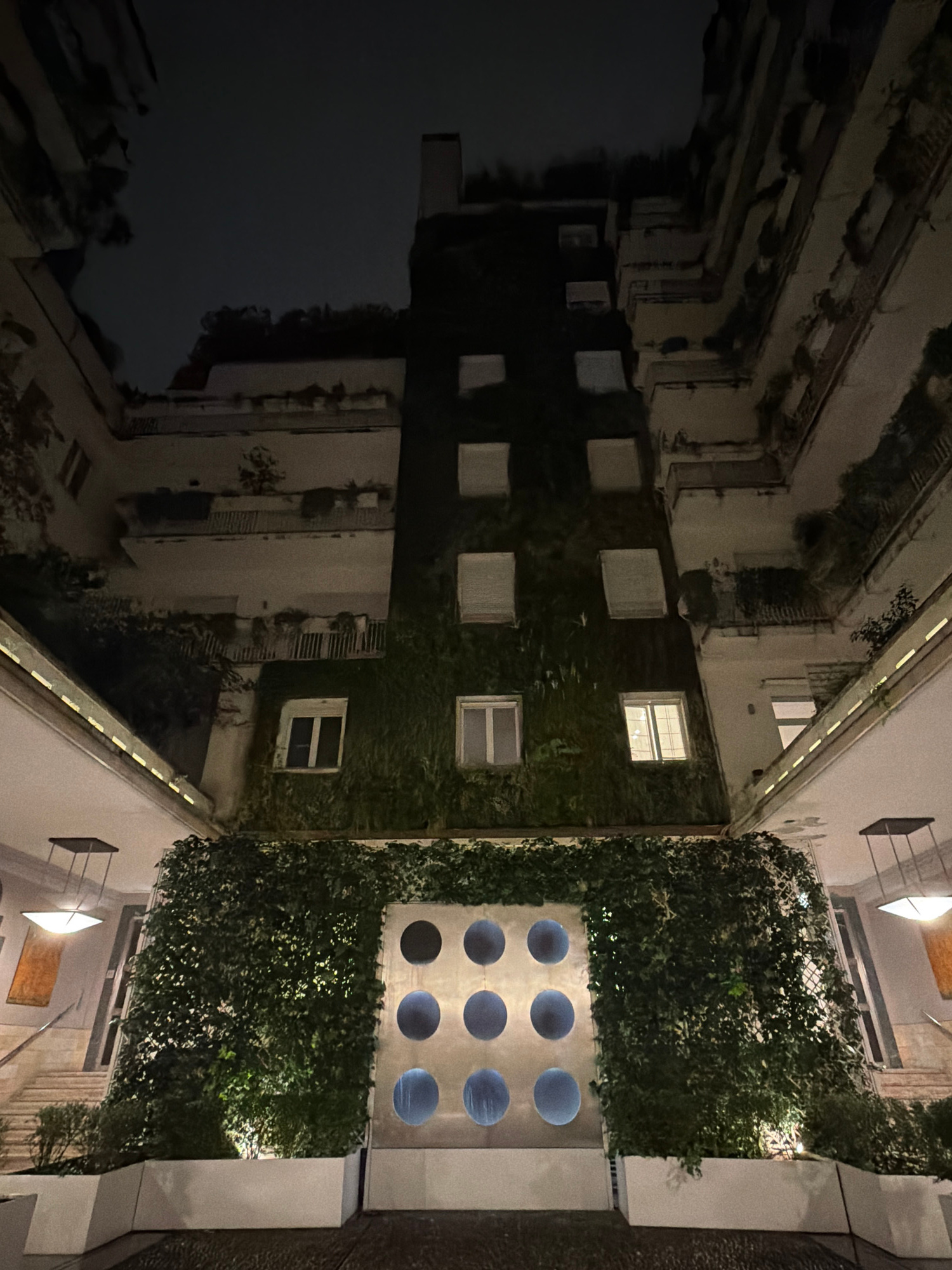The image depicts an internal courtyard at night in Milan, Italy. The scene is illuminated by warm artificial lights. The buildings surrounding the courtyard are covered in ivy. One section of the bui…read more