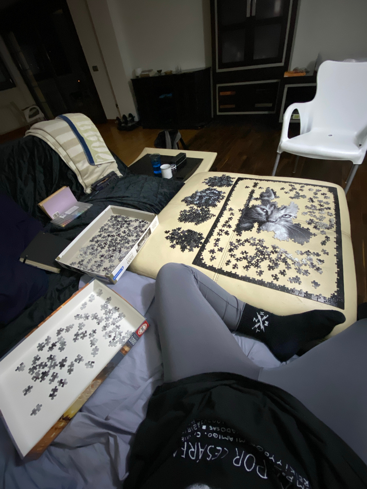 The scene depicts an indoor setting, possibly a living room, where a jigsaw puzzle of a cat is partially completed on a cushioned chair. Two open puzzle boxes, each containing loose puzzle pieces, are…read more