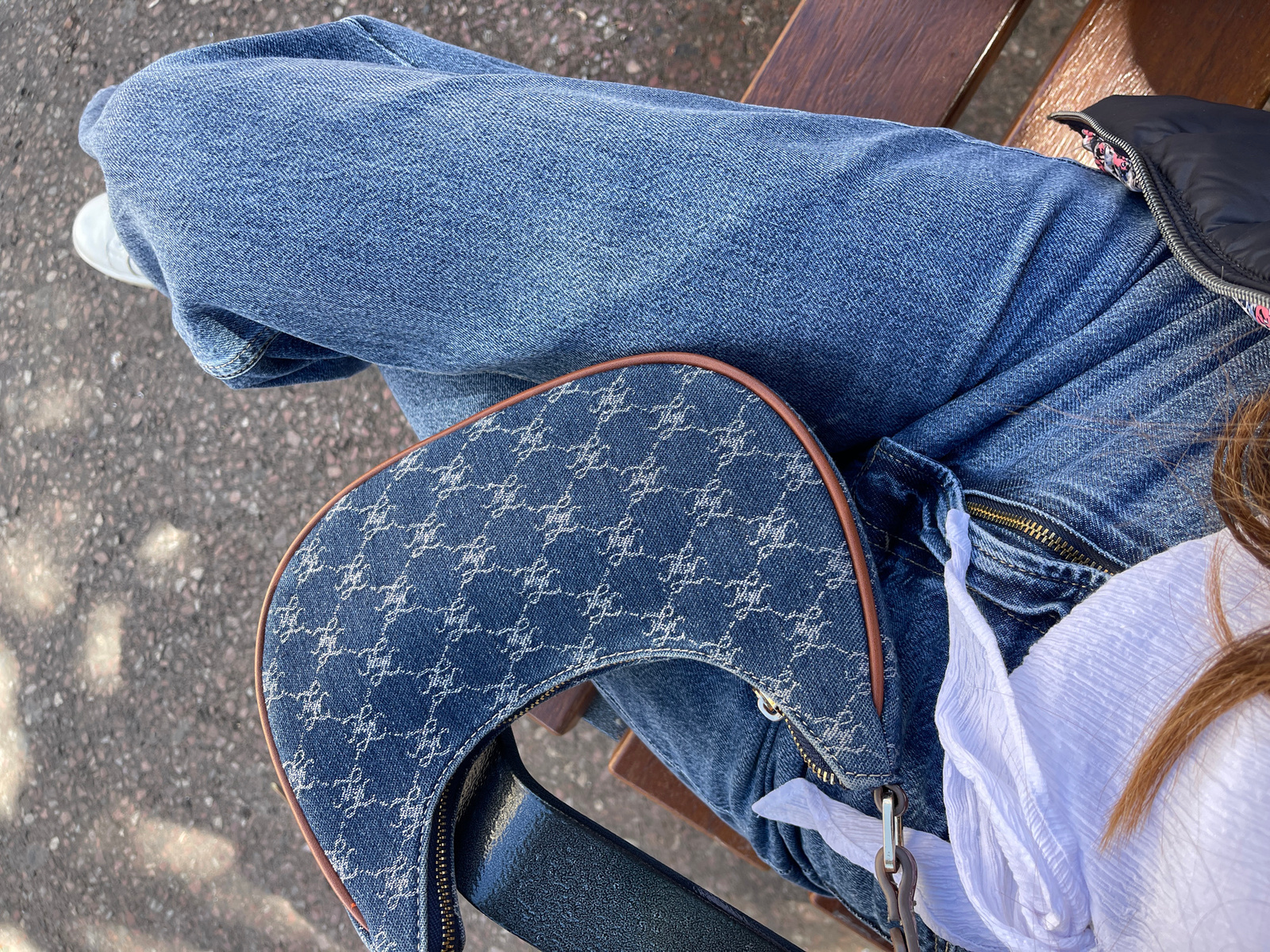 A high-angle shot shows a person seated, wearing blue jeans. A blue patterned handbag rests on their lap. A white shirt is visible on the right side of the frame. Part of a black jacket is visible in…read more