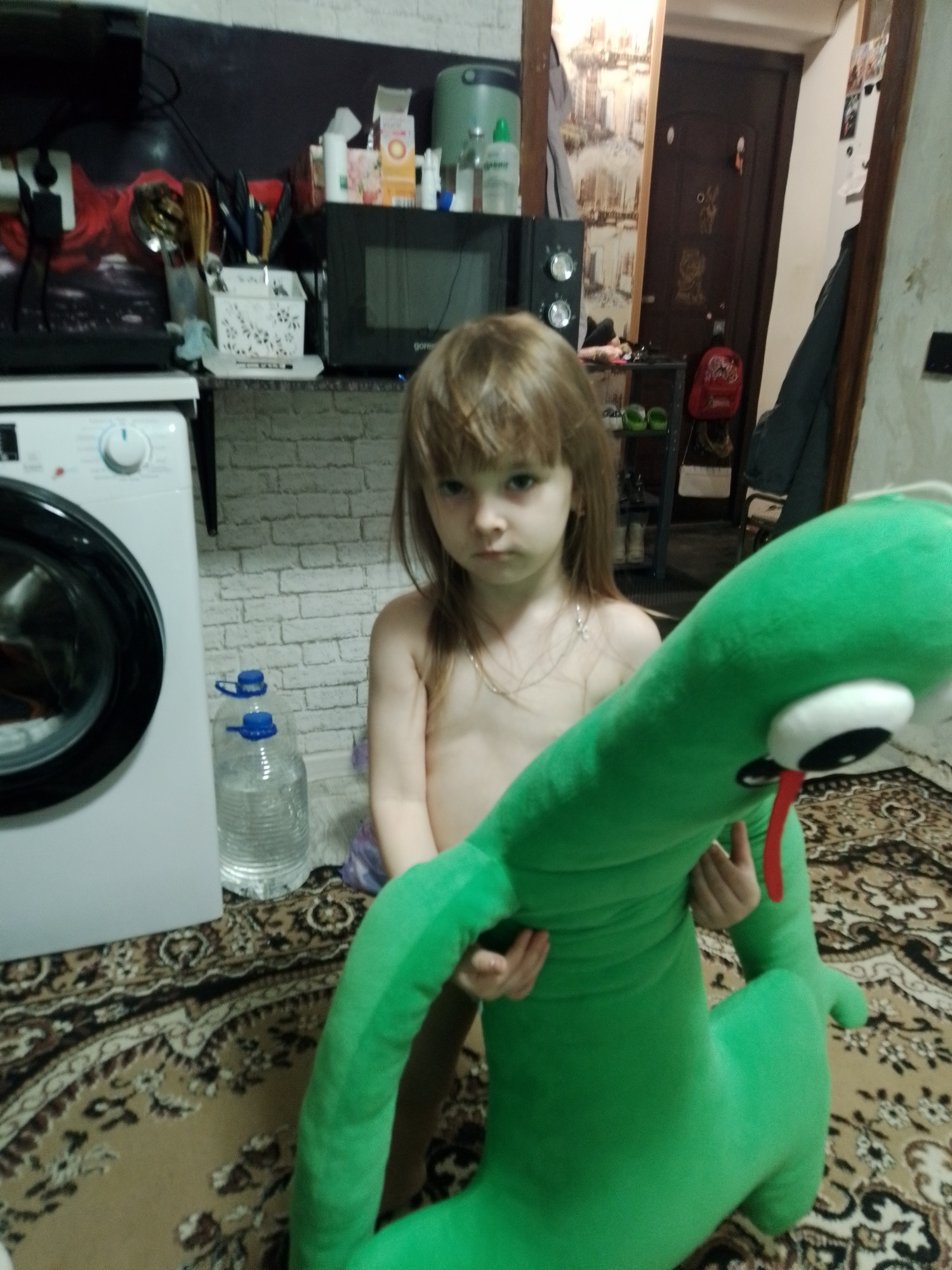 A young child with light brown hair stands indoors on a patterned brown and beige carpet. She is holding a green plush toy resembling a snake with a red tongue. In the background are a washing machine…read more