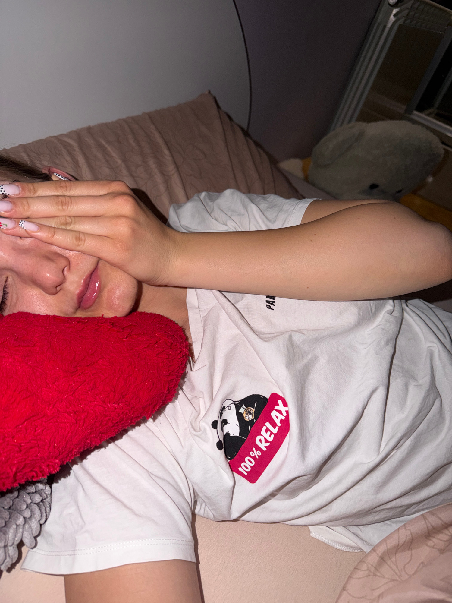 The image shows a person lying on a bed. The person is wearing a white t-shirt with a "100% RELAX" graphic and holding their hand over part of their face. A red fluffy object is also near their face.…read more
