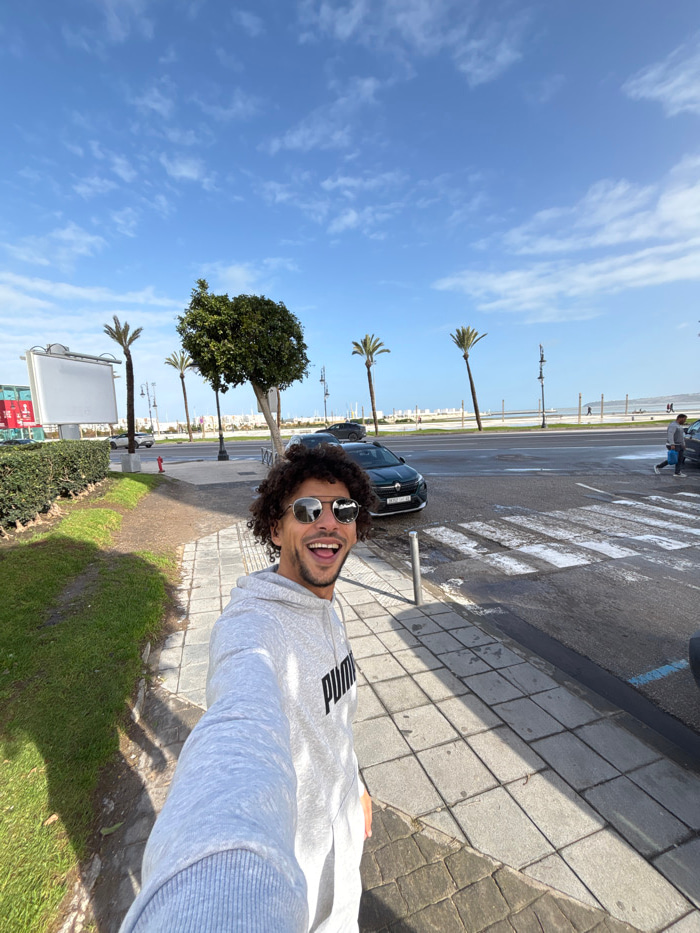The image depicts a male individual taking a selfie on a sunny day in Tangier, Morocco, specifically on the Corniche or coastal promenade area. The primary subject, a man with curly dark hair, light…read more